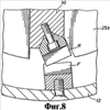 На Фиг.8 представлен в увеличенном виде фрагмент Фиг.7, показывающий взаимодействие вращающегося и неподвижного зубьев устройства в главной измельчительной камере.