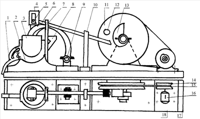 После настройки включается электродвигатель 16, который с помощью текстропа 15 приводит во вращение шкив 11 с закрепленными на нем пальчиком 12 и улитковым выступом 13. Шкив 11, делая оборот вначале пальчиком 12, а затем улитковым выступом 13 вдавливают длинное плечо коромысла 6 вниз до момента его соскока с выступа улитки. Ограничитель 10 придерживает длинное плечо от черезмерного подскока вверх, а в это время короткое плечо коромысла 6 поднимает ползунок 5, который движется вверх, увлекая за собой молот 3, закрепленный на шарнире 9, поднимая его на определенную высоту и сбрасывает его вниз на прослойку песка в виде пульпы, находящуюся между наковальней и молотом, загружаемой в измельчитель через воронку 8.