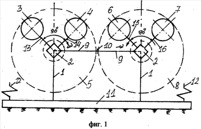 Дебалансы 3, 4 полумодуля 5 связаны с валом 2 штоками (тягами) 13, 14, а дебалансы 6, 7 полумодуля 8 связаны со своим приводным валом 2 тягами 15, 16 соответственно. На фиг.1 показано положение дебалансов с максимальным значением их радиусов вращения центров масс. В каждом полумодуле дебалансы 3, 4 и 6, 7 своими штоками смещены в пространстве на углы 90°.