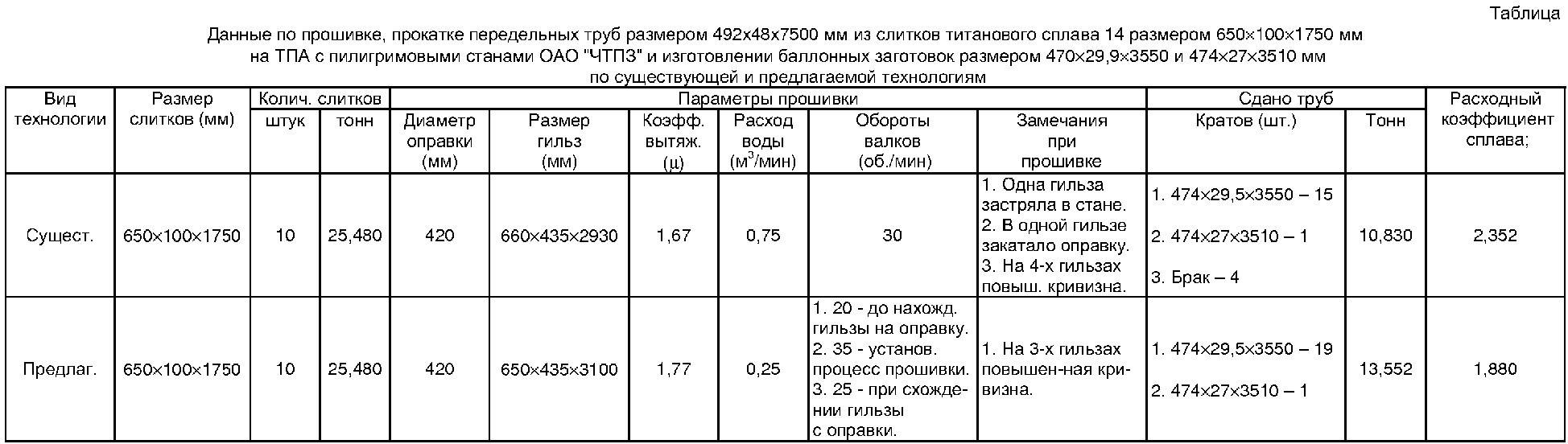 1. Способ прошивки слитков и заготовок из сплавов на основе титана в станах косой прокатки, включающий нагрев сверленых слитков или заготовок в муфелях в трехзонных методических печах до температуры пластичности, прошивку слитков или заготовок в гильзы в станах косой прокатки на оправке с разной скоростью вращения рабочих валков, при этом от момента захвата слитка или заготовки валками до момента полного нахождения их на оправку прошивку производят со скоростью вращения рабочих валков 20-25 об/мин, установившийся процесс прошивки производят со скоростью вращения валков 35-40 об/мин, а на выходе оправки из гильзы скорость вращения валков снижают до 25-30 об/мин. 2. Способ по п.1, отличающийся тем, что гильзу прошивают по наружному диаметру размер в размер с вытяжкой 1,7-1,9. 3. Способ по п.1, отличающийся тем, что для снижения газонасыщения наружной и внутренней поверхностей гильз при прошивке из-за подачи охлаждающей жидкости на валки и дорновую штангу прошивного стана после выхода гильзы из валков подачу воды на валки снижают в 2-3 раза, а на дорновую штангу прекращают полностью.