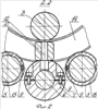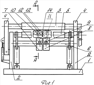 Стойки 2 соединены между собой центральной цилиндрической балкой 6, на которой смонтированы два корпуса 7; 8, каждый из них разъемный и связанный стяжными элементами 9. Корпусы 7; 8 имеют возможность раздвигания между собой вдоль балки 6. На верхней части каждого из корпусов жестко установлены колонки 10; 11, взаимодействующие с роликами 12 с возможностью вращения на колонках 10; 11. При этом нижние валки 5 снабжены полукольцами 13, закрепленными стяжными элементами 9.