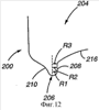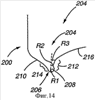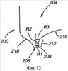 Фигура 13 иллюстрирует нижнюю куполообразную часть 204 емкости 200 для напитков после проведения операции переформования, соответствующей одному варианту реализации настоящего изобретения. После осуществления данного процесса переформования внутренняя поверхность 208 кольцеобразного опорного элемента 206 содержит часть 212, имеющую сравнительно выраженную «крюкообразную» форму. Кольцеобразный опорный элемент 206 имеет радиус R2, значение которого меньше любого из значений R1 или R3, что определяет данную крюкообразную часть 212. Крюкообразная часть 212 способствует улучшению прочностных характеристик нижней куполообразной части 204 емкости 200 для напитков и будет описана более подробно далее.