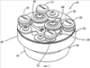 Далее со ссылками на Фигуры 8-10 будет описана работа устройства 20 переформования и перепрофилирования. На фигуре 8 изображен вид спереди устройства 20 системы переформования и перепрофилирования и емкости 116 для напитков, закрепленной на оправке 120. На Фигуре 9 показан поперечный разрез Е-Е системы с Фигуры 8. Фигура 10 содержит поперечный разрез системы с Фигуры 8, который показывает емкость 116 для напитков контактирующую с устройством 20 переформования и перепрофилирования. В варианте реализации, проиллюстрированном на Фигурах 8-10, емкость 116 для напитков закреплена на оправке 120 в стационарном, неподвижном положении. Оправка 120 и емкость 116 для напитков двигаются по направлению к устройству 20 переформования и перепрофилирования до тех пор, пока емкость для напитков не войдет в контакт с устройством. Нижняя часть емкости для напитков имеет кольцеобразный опорный элемент 124 с внутренней поверхностью 128 и внешней поверхностью 132. Оправка 120 и емкость для напитков 116 выровнены так, чтобы кольцеобразный опорный элемент 124 емкости для напитков контактировал с кольцеобразным буртиком 68 переформовочного ролика. Оправка 120 и емкость для напитков 116 продолжают двигаться по направлению к устройству 20 переформования и перепрофилирования, причем кольцеобразный опорный элемент 124 контактирует с кольцеобразным буртиком 68 переформовочного ролика до тех пор, пока переформовочные ролики 60 полностью не войдут во взаимодействие с внутренней поверхностью 128 кольцеобразного опорного элемента 124, а перепрофилировочные ролики 72 не зацепятся за внешнюю поверхностью 132, как показано на Фигуре 10. Аналогично оправка 120 и емкость 116 для напитков могут быть неподвижны, а устройство 20 для перепрофилирования двигается навстречу емкости 116 для налитков или как устройство 24 для перепрофилирования, так и оправка 120 и емкость 116 для напитков могут двигаться друг навстречу другу.