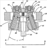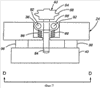 На Фигурах 4-7 показаны поперечные разрезы А-А, В-В, С-С и D-D устройства на Фигурах 1-3 соответственно. Как проиллюстрировано на Фигуре 4 переформовочные ролики 60 крепятся к вкладышам 84 переформовочных роликов, которые выступают в блок 40 скользящих контактов. Вкладыши 84 переформовочных роликов выступают в блок 40 скользящих контактов под углом по отношению к воображаемой плоскости, которая расположена перпендикулярно к передней поверхности 32 роликового блока и отцентрирована по отношению к паре переформовочных роликов 60. В одной реализации вкладыши 84 переформовочных роликов являются шариковыми опорами прямолинейного движения. Пружины 86 (Фигура 5) расположены в центральном отверстии 36 роликового блока и взаимодействуют с парой переформовочных роликов 60 для того, чтобы давить на переформовочные ролики 60 по направлению от блока 40 скользящих контактов. Когда к переформовочным роликам 60 прикладывается сила, переформовочные ролики 60 одновременно двигаются по направлению к блоку 40 скользящих контактов и также по направлению к внешнему кольцеобразному краю 28 роликового блока. Каждый переформовочный ролик 60 связан со связующим блоком 88, связующие блоки 88 соединены посредством направляющих штифтов 92, таким образом обеспечивается то, что переформовочные ролики 60 двигаются согласовано. Хотя в предпочтительном варианте реализации оба переформовочных ролика 60 двигаются наружу одновременно, возможно, чтобы в конкретный момент времени двигался только один из переформовочных роликов 60.