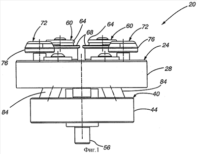 Более конкретно, на Фигурах 1 и 2 имеются вид спереди и вид сверху соответственно, а на Фигуре 3 содержится вид в изометрии устройства 20 переформования и перепрофилирования, соответствующего настоящему изобретению. Устройство 20 переформования и перепрофилирования обычно имеет роликовый блок 24, который в свою очередь содержит внешний кольцеобразный край 28 роликового блока, переднюю поверхность 32 роликового блока и центральное отверстие 36 роликового блока. Устройство 20 переформования и перепрофилирования также содержит блок 40 скользящих контактов, который имеет внешний кольцеобразный край 44 блока скользящих контактов, переднюю поверхность блока скользящих контактов и центральное отверстие 52 блока скользящих контактов. Каждый роликовый блок 24 и блок 40 скользящих контактов крепятся к установочной оси 56 через центральное отверстие 36 роликового блока и центральное отверстие 52 блока скользящих контактов. На роликовом блоке 24 расположена пара переформовочных роликов 60, имеющих внешний край 64 и кольцеобразный буртик 68. Также на роликовом блоке 24 расположены две пары перепрофилировочных роликов 72, которые имеют внешний край 76. Установочная ось 56 связана с двигателем или другим источником энергии, который придает установочной оси 56 вращательное движение.