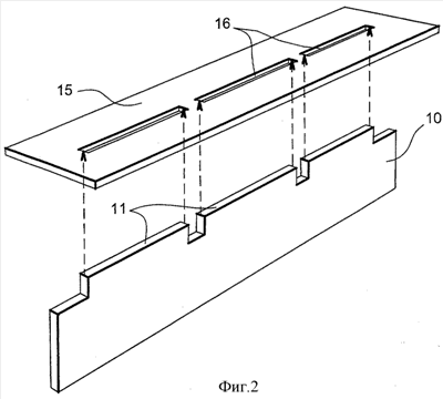 Как показано на фиг.2, первый узел, который можно сваривать с использованием способа сварки, согласно изобретению состоит из двух элементов: ножки 10 Т-образного узла и головки 15 Т-образного узла. Ножка 10 является прямоугольной пластиной заданной толщины с лапками 11 заданной длины, расположенными на заданном расстоянии друг от друга. В соответствии с этим прорези 16 образованы в головке 15 с длиной и шириной, соответствующими лапкам 11 ножки 10. Как показано на фиг.3, можно легко понять, что сборка состоит во вставлении лапок 11 ножки 10 в прорези 16 в головке 15.