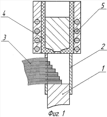 На алюминиевой шине 1 закреплена литейная форма 2, в которую через прорезь в боковой стенке помещен катодный спуск 3 из набора алюминиевых пластин. Алюминиевая шихта в тигле 4 расплавлена и нагрета до температуры ведения процесса с помощью индуктора 5. Через выпускной клапан в дне тигля расплав алюминия подают в литейную форму к наплавляемым поверхностям шины и катодного спуска. После кристаллизации расплава образуется прочное сварное соединение шина – катодный спуск.