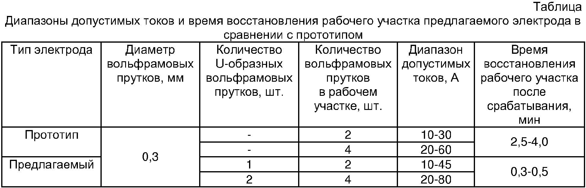 Восстановление рабочего участка электрода после срабатывания выполняется в следующей последовательности: ослабляется зажатие электрода в цанге сварочной горелки; рабочие элементы выдвигаются не необходимую длину; электрод снова зажимается в цанге; свободные концы рабочих элементов сводятся вместе, образуя новый рабочий участок. Количество и диаметр прутков, образующих рабочий элемент, зависят от величины сварочного тока. Для формирования рабочего участка электрода достаточно лишь приблизить свободные концы рабочих элементов друг к другу: физический контакт между ними необязателен. При отсутствии физического контакта возбуждение дуги производят при максимально допустимом токе для одного прутка, повышая затем его до необходимого значения. Практика показала, что для возбуждения дуги непосредственно на рабочем токе достаточно механического контакта между свободными концами рабочих элементов. Число прутков, образующих рабочий элемент, может изменяться. Минимально допускается использование одного U-образного прутка из тугоплавкого металла, в этом случае рабочий участок электрода будет образован двумя его свободными концами. Максимальное число прутков ограничивается числом пар осесимметричных прорезей во внутренней детали корпуса электрода. Однако количество U-образных прутков не должно быть больше четырех, так как чрезмерное количество прорезей в деталях корпуса отрицательно сказывается на надежности фиксации прутков по причине снижения общей жесткости корпуса. Сравнительные данные по диапазонам допустимых токов, а также временные показатели восстановления рабочего участка для предлагаемого электрода и прототипа приведены в таблице.