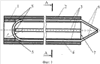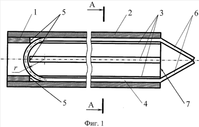 Длина прорезей 3 составляет 0,75-0,9 длины корпуса, ширина – 1,1-1,5 диаметра применяемых вольфрамовых прутков. Прорези во внутренней детали 1 корпуса служат для размещения и фиксации U-образных прутков 4 из тугоплавкого металла, образующих рабочий элемент (на фиг.1 и 2 условно показан только один U-образный пруток).