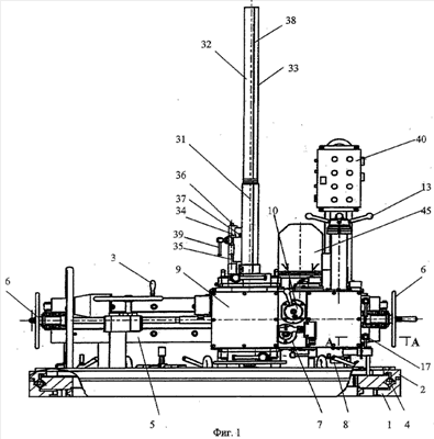 Станок устанавливается основанием 1 на обрабатываемое изделие через технологические подставки и крепится к ним (технологические подставки и обрабатываемое изделие на фиг.1 не показаны).