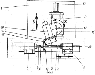 На шлифовальной бабке 11 расположен шлифовальный шпиндель 14, посредством второй поворотной оси 13 он связан со шлифовальной бабкой 11 с возможностью поворота. Положение второй поворотной оси 13 показано на фиг.2. Вторая поворотная ось 13 расположена перпендикулярно первой поворотной оси 12 и в обычных положениях пересекает совместную продольную ось 23 бабки 2 изделия, машинной детали 17 и задней бабки 3.
