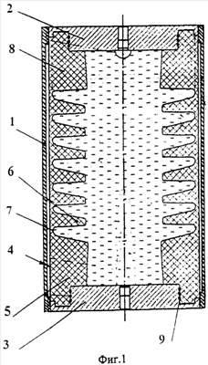 Форма для изготовления методом изостатического прессования заготовки керамического высоковольтного изолятора используется для изготовления преимущественно фарфорового изолятора, имеющего форму тела вращения. Форма содержит цилиндрический корпус 1 с торцевыми крышками 2 и 3, образующими в его полости гидравлическую камеру 4 высокого давления. Камера 4 сообщается с источником высокого давления, для чего герметично по периметру ее торцов размещена полая разрезная по продольной плоскости, т.е. по плоскости, проходящей через продольную ось тела вращения, на симметричные части (фиг.2) матрица 5 с профильной внутренней поверхностью в виде чередующихся вдоль оси матрицы формообразующих кольцевых выступов 6 и впадин 7 с соотношением их диаметров в диапазоне от 1,5 до 2,7 и с концевыми цилиндрическими частями 8, длина которых превышает максимальный диаметр формообразующих частей – выступов 6 и впадин 7. Разъемные части матрицы 5 (см. фиг.1, 2) по поверхностям их разъема соединены между собой герметично и с возможностью равномерной передачи давления на материал в ее полости для формирования заготовки, как правило, с равной плотностью по объему. Такой результат достигается сочетанием формы и материала на основе полимера.