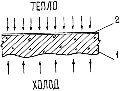 Способ поясняется следующим примером (см. чертеж). На поверхность бетонного изделия 1 наносят отделочный слой 2 (легкоплавкой эмали или глазури) и закрепляют оплавлением, например с использованием электропечи. Одновременно с оплавлением отделочного слоя на одной стороне изделия с другой его стороны, противолежащей обрабатываемой, изделие охлаждают (например, с использованием холодильной установки), препятствуя таким образом распространению тепла в толщу изделия и замедляя процессы дегидратации. После оплавления отделочного слоя охлаждение изделия прекращают.