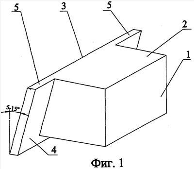 Как показано на фиг.1, лицевой камень имеет трапециевидное, расширяющееся книзу, поперечное сечение. Наклон задней грани по отношению к вертикали составляет 5-15 градусов, что определяется технологическими условиями формовки камней и размерами возводимой стены. При этом задняя грань 3 выступает за пределы нижней и обеих боковых граней, образуя боковые выступы 5 и нижний замковый выступ 4. Пример облицовки стены предлагаемыми камнями и колоннами (для примера показана колонна прямоугольного сечения) приведен на фиг.3.