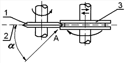 Способ разрезания осуществляется следующим образом: изделие кольцевой формы (на фиг. не показано), в частности каркасно-брекерно-протекторный браслет покрышки (поверхности которого являются топологическими поверхностями к поверхности тора), подводится и надевается по направлению А внутренней частью на нож 1 под углом к плоскости 2, ортогональной к осям вращения ножа и опорного ролика 3. Разрезание и подача изделия осуществляется за счет контакта ножа и ролика, при этом нож имеет привод, а ролик установлен с возможностью вращения. Подвод разрезаемого изделия и его надевание на нож осуществляются вручную в рабочем положении ножа и ролика (то есть, когда нож и ролик контактируют между собой). После того как кольцевое изделие будет под углом надето на нож таким образом, чтобы край изделия непосредственно контактировал с зоной реза (с зоной контакта между роликом и ножом), включается привод ножа и происходят подача изделия в зону реза и его разрезание. Поскольку разрезание осуществляется под углом к центральной плоскости кольцевого изделия (то есть к плоскости, ортогональной оси вращения изделия), разрезание изделия идет по спирали до полного разрезания всего изделия. В результате образуется спиралевидная лента, длина и ширина которой зависят от угла подвода изделия к ножу. При больших углах получается более широкая и менее длинная спиралевидная лента, при меньших углах ширина ее меньше, а длина больше. Выполнение режущего лезвия ножа с толщиной, большей ширины выемки в ролике, обеспечивает в процессе резания вращение ролика (в результате его контакта с ножом) и фиксацию неразрезанных элементов армированного каркасно-брекерно-протекторного браслета за счет зажима разрезаемого материала между поверхностями, образующими режущую кромку, и входными (внешними) частями выемки в ролике. В результате обеспечивается подача и удержание разрезаемого материала в зоне реза.