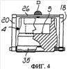 Подъем матрицы 4 начинается в угловой позиции . Однако стержни 26 и 27 все еще располагаются рядом друг с другом, а после достижения матрицей угловой позиции , в которой валик 35 обкатывается по наклонному участку 33 кулачка 32, вызывая разведение стержней (см. фиг.6), полученная порция D попадает в полость 5. Как показано на фиг.6, стержни 26, 27 разведены в полости 5, когда матрица 4 находится радом с пуансоном 3. Сжатие порции D заканчивается (см. фиг.7 и 8) при дальнейшем вращении формующего узла до угловой позиции .