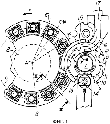 Как видно на фиг.1-5, устройство включает поворотное загрузочное устройство, обозначенное позицией 1, которое вращается в направлении Х вокруг вертикальной оси. Поворотное загрузочное устройство включает поддерживающий элемент 2, далее называемый барабаном, на котором установлено несколько формовочных узлов (см. фиг.5); каждый формовочный узел включает верхний пуансон 3, который, по существу, является неподвижным относительно барабана 2, и нижнюю матрицу 4, которая может перемещаться вдоль оси В на одном уровне с пуансоном 3.
