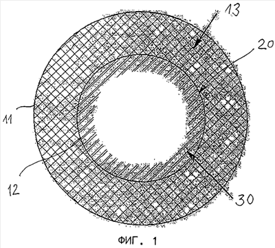 На фиг.1 показано поперечное сечение трубы 13 из пенопласта, в данном случае из вспененного эластомера, с наружной поверхностью 11 и внутренней поверхностью 12. Внутренняя поверхность 12 трубы покрыта тонким липким слоем 20, который удерживает на ней одни из концов волокон дополнительного слоя 30. Волокна расположены по существу радиально. Волокна изготовлены из полимера, температура плавления которого больше температуры плавления пенопласта. Волокна имеют по существу одинаковую линейную плотность и длину и равномерно покрывают от 2 до 20% всей покрытой липким слоем 20 внутренней поверхности 12 трубы.