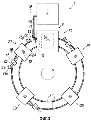 Предпочтительно, как показано на фиг.3, выполнить узел инжектора 8, обеспечивающий подачу расплавленной пластмассы, и дополнительный узел 9, обеспечивающий подачу соответствующей текучей среды, находящейся под высоким давлением, таким образом, чтобы они, по существу, были стационарными, тогда как формовочные узлы 3 выполнены с обеспечением возможности совершать движение по траектории 25, имеющей, по существу, замкнутый путь, например по круговой траектории. При этом траектория 25 такого движения задается при помощи рельсовых направляющих, по которым движутся формовочные узлы.