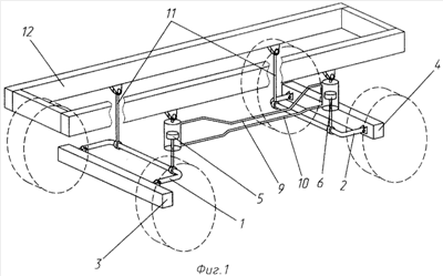 Крепление по заявляемой схеме цилиндров 7 гидравлических стоек к раме автомобиля позволяет уменьшить их перемещения при работе, а это, в свою очередь, позволяет выполнить гидропроводы большего сечения, увеличив эффективность работы, снизить неподрессоренные массы, т.к. весь гидропровод крепится к раме, увеличить надежность гидросистемы в целом за счет того, что перемещения гидравлических стоек и гидропроводов небольшие, а все перемещения приходятся на поршни со штоками и стабилизаторы, которые крепятся к мостам автомобиля.