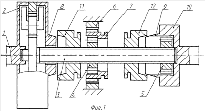 Бесступенчатая АКП состоит из входного вала 1, жестко соединенного с корпусом импульсного механизма 2, кинематически связанного с промежуточным валом 3, на котором установлены два механизма свободного хода – корпусной 4 и выходной 5. Наружная обойма 6 корпусного МСХ с корпусом АКП соединена с помощью кулачковой муфты 7. С корпусом импульсного механизма жестко соединена внутренняя полумуфта 8 одной из кулачковых муфт, такая же полумуфта второй муфты 9 жестко соединена с маховиком 10 выходного вала. На промежуточном валу между корпусом импульсного механизма и корпусным МСХ расположена наружная обойма 11 одной кулачковой муфты, на промежуточном валу между маховиком выходного вала и корпусным МСХ – наружная полумуфта 12 второй кулачковой муфты. Наружная полумуфта 12 жестко соединена с кулачковой муфтой 7 корпусного МСХ.