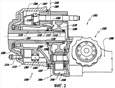 В предпочтительном варианте выполнения моста 101 в портальной компоновке, предложенного согласно этому изобретению и показанного на фиг.2, картер 102 моста 101 на своем одном конце имеет главный привод 103, отодвинутый в сторону так, как описывалось в связи с фиг.1, а также имеет узел 104 портального привода и узел 108 концевого привода колеса на каждом из обоих концов моста 101. В кожухе 105 узла 104 портального привода расположен обычный портальный привод 106, а кожух 109 зубчатой передачи узла 108 концевого привода колеса соединен винтами 107 с кожухом 105 портального привода. В этом варианте выполнения портального моста 101, предложенного согласно этому изобретению, вращающаяся ось 112 вращается на роликовых подшипниках 110 и 111 с коническими роликами, находящихся в кожухе 109 зубчатой передачи узла 108 концевого привода колеса. На наружном фланце вращающейся оси 112 закреплен тормозной барабан 113 (который может быть заменен тормозным диском в другом варианте осуществления изобретения, снабженном дисковыми тормозами). В месте соединения указанного фланца вращающейся оси 112 и тормозного барабана 113 расположены винты 114, удерживающие обод колеса транспортного средства (не показан).