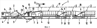 Изображенный на фиг.2 в увеличенном виде и подробно накопительный вагон 12 содержит в качестве рабочего устройства 8 служащий в качестве поверхности дна ленточный транспортер 13 и дополнительный, выступающий за конец вагона ленточный транспортер 13 для передачи мусора 10 на примыкающий накопительный вагон 12. Каждому ленточному транспортеру 13 придан свой привод 20. Щебень 9, захваченный при непрерывном продвижении выемочной цепью 23 (фиг.1), подают на очистку к установке 24 для грохочения. Возникающий при этом мусор 10 транспортируют по образующим общий транспортный тракт ленточным транспортерам 13 к позиционированному на другом конце рабочего поезда 1 накопительному вагону 12 и накапливают в нем для удаления. Для этой цели служащий в качестве поверхности дна ленточный транспортер 13 движется с меньшей скоростью.