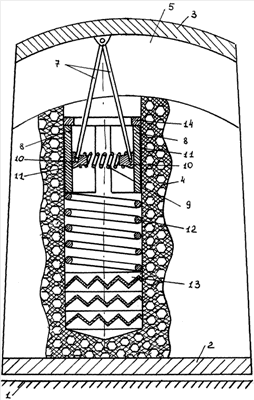 В исходном статическом состоянии пакет 13 гофрированных дисков не деформирован, пружина 12 частично сжата и прижимает накладки 8 торцами к фиксирующему кольцу 14, прижимная пружина 9 исходно сжата и прижимает накладки 6 шероховатыми наружними боковыми поверхностями 11 /участками полого цилиндра/ к внутренним цилиндрическим стенкам отверстия 6. Сжатая пружина 9 создает первичное усилие поджатия накладок 8 к стенкам отверстия 6 /нормальное усилие/, обуславливающее возникновение при попытке взаимного осевого смещения в зоне шероховатых поверхностей 11 сил сухого трения. При слабых лобовых ударах подвижной рамы 3 о препятствие и соответственно малых смещениях рамы 3 происходит некоторое увеличение угла между рычагами 7, в соответствии с этим – увеличение нормального давления на накладки 8 при одновременном смещении их шероховатых поверхностей 11 относительно стенок отверстия 6, сопровождающееся сжатием пружины 12, однако с усилием, не приводящим пока к пластическим деформациям пакета дисков 13. Такое смещение за счет возникновения указанных выше сил сухого трения и сил упругости приводит к энергопоглощению слабых ударов, диссипации их энергии, преобразованию кинетической энергии удара в тепловую и потенциальную энергию упруго-сжатой пружины. После окончания удара пружина 12 разжимается, преодолевая силы сухого трения /так подобрано ее соотношение жесткостных параметров/, и возвращает систему в исходное состояние. При сильном лобовом столкновении и, соответственно, резком увеличении угла между тягами 7 огромные нормальные напряжения на накладках 8 приводят к продавливанию последними стеной отверстия 6 с дальнейшим разрушением накладками 8 ячеистой структуры слоя 4 как в поперечном, так и одновременно в продольном направлениях вдоль всего отверстия 6. Такое смятие ячеек слоя 4 происходит практически одновременно по всему объему слоя 4 и приводит к интенсивному энергопоглощению этим слоем кинетической энергии удара. Одновременно с этим после полного сжатия пружины 12 происходит пластическая деформация смятия пакета 13 дисков, также сопровождающаяся активным энергопоглощением. При боковых ударах за счет равномерного распределения отверстий 6 по сечению бампера, а главное – за счет изотропного равномерного распределения ячеек по всему объему слоя 4 упруго-пластичного материала характер энергопоглощения по сравнению с лобовым ударом практически не изменяется. Любое по направлению и точке приложения к бамперу соударение сопровождается осевым перемещением рычагов 7 с накладками 8 в полости отверстий 6, возникновением сил сухого трения и упругости, а при значительной интенсивности удара – пластической деформацией с разрушением ячеистой структуры слоя 4 и пакета гофрированных дисков 13. Для восстановления конструкции бампера после сильного удара с разрушением структуры необходимо заменить слой 4 ячеистой структуры и пакет 13 дисков.