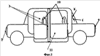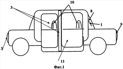 Например, в качестве обязательной комбинации кодируемых частей транспортного средства принимают нанесение уникального буквенно-цифрового, с включением графических элементов 2, кода 1 видимого изображения на части, выполненные из стекла 8, предпочтительно на переднее лобовое и заднее стекла, невидимого изображения на декоративные части салона, выполненные из пластика 9 или синтетического или органического материала 10 или металла 11. Дополнительно возможна простановка-нанесение уникального буквенно-цифрового, с включением графических элементов 2, кода 1 на рефлекторах, указателях поворота, задних фонарях, аккумуляторе и радиоаппаратуре.