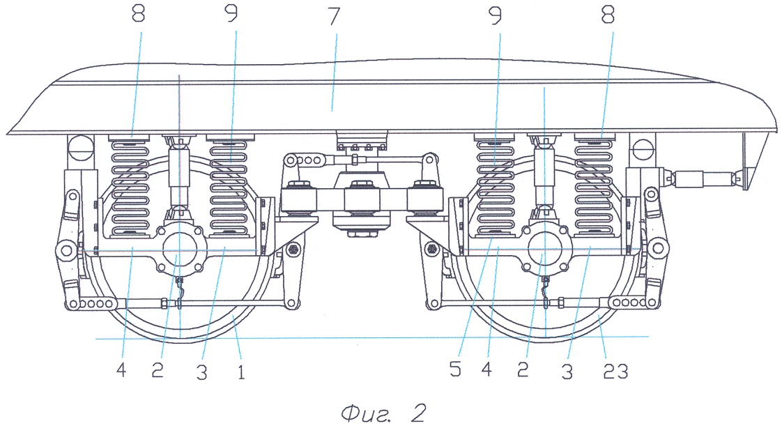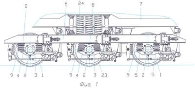 на фиг.2 изображено буксовое рессорное подвешивание в составе двухосной безрамной тележки, общий вид;