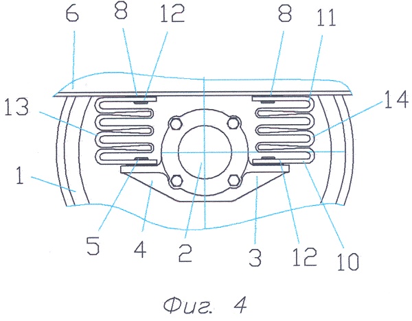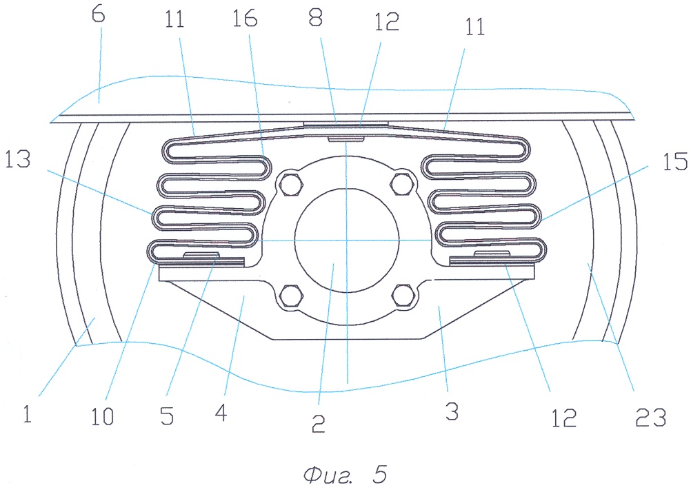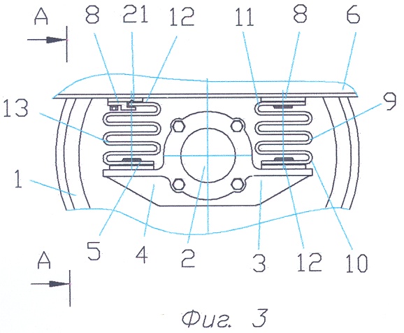 Выполнение пружин 9, 14, 15, 16, 17 и 18 соответственно из пластин переменной толщины или из многослойной пластины, содержащей пластины одинаковых или различных физических свойств, или из пустотелого фасонного профиля достигается при одновременном выполнении требований по их прочности и податливости. При этом эффект при выполнении пружин из пластин переменной толщины достигается снятием материала в слабо нагруженных местах, при использовании пустотелого фасонного профиля – за счет рационального использования материала в поперечном сечении пластины, а при использовании многослойной пластины из не связанных между собой пластин (например, в виде набора из пластин пружинной стали или (и) пластин титанового сплава) или жестко соединенных между собой пластин различных физических свойств (например, в виде пластины пружинной стали, армированной с двух сторон пластинами титанового сплава или (и) алюминиевого сплава) – за счет максимально эффективного использования поперечного сечения пружины. В последнем примере в срединной стальной пластине за счет разности модулей упругости стали и сплавов (титановых, алюминиевых или других) напряжения будут такими же высокими или выше как и на внешних пластинах, что и обеспечивает эффект.