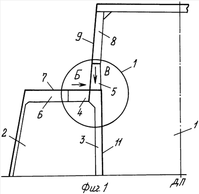 В предложенной конструкции наиболее нагруженное место ангара 1 – пересечение бимса 6 и вертикальной стойки ангара не имеет стыков, которые благодаря выступам 4 и 5 фигурной стойки 3 отодвинуты от палубы 7 и стенок 9 и 11. Это позволяет легко выполнить необходимую приформовку, обеспечивающую равнопрочность набора. То, что стенка 9 второго яруса прорезает палубу 7, позволяет связать ее не только с палубой 7 с двух сторон, но и с боковыми выступами 4, а отстояние ее от стенки 11 увеличивает полезный объем ангара 1. Прорези 10 и 13 дают возможность осуществить технологичную сборку набора. Фактически стенка 9 разделяет палубу 7 на две части – основную и закладную 12, что облегчает выполнение прорезей 13 в закладных частях 12 палубы 7. Фигурная стойка 3 должна иметь общий усиленный поясок с обоими выступами 4 и 5, поэтому она в поперечном сечении до выступов выполнена с двухсторонними усиленными поясками 14.