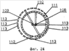 На фиг.24 и ниже: 111 – неподвижный контейнер для семян, 112 – щель для подачи семян к отверстиям барабана 110, закрываемая шторкой (не показана из-за мелкости) при отсутствии вращения барабана 110, 113 – отверстия в барабане 110.