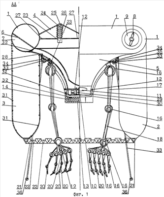 На фиг.1 и ниже: 1 – торообразная камера с газом, 2 – левый задний баллонет с газом, 3 – правый задний баллонет с газом, 4 – правая передняя камера с газом переменного объема, 5 – нижняя центральная камера с газом, 6 – мембрана, отделяющая туннель 7 с воздухом от камеры 1, 8 – вентилятор, 9 – входые и выходные сопла туннеля 7, 10 – гондола водителей, 11 – переднее стекло кабины, 12 – болт-ось, держащая манипулятор, 13 – противовес манипулятора с аккумуляторными батареями 14, 15 – рука манипулятора, 16 – сочленения суставов манипулятора, 17 – плечо, 18 – предплечье, 19 – ладонь, 20 – фаланги пальцев, 21 – ферма с треугольной решеткой, 22 – пазы фермы 21 для установки балок палубы или навесного инструмента, 23 – электродвигатель, 24 – ось электродвигателя с резьбой, 25 – гайка, 26 – сильфонообразная складка оболочки камеры 4 вокруг оси 24, 27 – тросы подвеса электродвигателя 23 к стенкам камеры, 28 – коридор для подъема из кабины 9 в отсек 7 с воздухом, 29 – опоры для оси 12, 30 – кресло, 31 – спираль каркаса, 32 – крышки люков, 33 – трос, 34 – зубчатое колесо, прижимающее трос 33 к скобе 35, 36 – кольцо на конце троса 33.