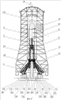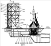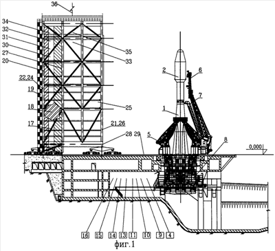– на фиг.2 показана мобильная башня обслуживания на стартовом комплексе в процессе предстартовой подготовки. Отдельные позиции заключены в квадратики, а пояснения по ним даны в тексте.