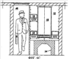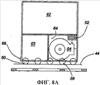 На фиг.8А-8В изображен вариант осуществления контейнера 18 по настоящему изобретению. Фиг.8А представляет собой поперечное сечение, а фиг.8В представляет собой перспективное изображение сзади. Контейнер 18 имеет оператор 52. Также предусмотрен движитель, связанный в рабочем положении с оператором 52. Движитель приспособлен для перемещения контейнера 18 в канале 12 для транспортировки в соответствии с командами, получаемыми движителем от оператора 52. Движитель предпочтительно представляет собой реверсивный двигатель 54 постоянного тока, соединенный в рабочем положении с одним или более ведомыми колесами 56 и получающий питание от токонесущего кабеля или соответствующей аккумуляторной батареи, соединенной в рабочем положении с движителем. Ведомое колесо 56 предпочтительно входит во фрикционный контакт с поверхностью направляющей 44, так что при приведении в действие двигателя 54 колесо 56 поворачивается, заставляя контейнер 18 перемещаться вдоль канала 12 для транспортировки. Дополнительно могут быть использованы колеса 60, не приводимые в движение и приспособленные для того, чтобы способствовать перемещению контейнера 18. Контейнер 18 предпочтительно имеет средства фиксации, приспособленные для того, чтобы входить в контакт с направляющими 44 внутри канала 12 для транспортировки с возможностью отсоединения так, чтобы обеспечить возможность плавного перемещения контейнера 18 по направляющим 44 без неожиданного выхода из контакта с ними. Может быть использовано любое пригодное средство фиксации, включая паз 58.