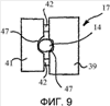 Фиг.9 показывает крепежное устройство 17 каната на виде вдоль разреза IX-IX из фиг.8. Первая конструктивная деталь 39 и вторая конструктивная деталь 41 скреплены друг с другом двумя винтами 42. Винтовое соединение, в частности, образовано так, что на канат 14 подъемника оказывается достаточное зажимное усилие. Для этого детали 39, 41 имеют зажимные поверхности 47. Зажимная поверхность 47 может иметь полностью или частично изогнутые, круглые или даже прямые поверхности. В частности, вся зажимная поверхность может иметь угловатость, предпочтительно для центрирования каната 14 подъемника в крепежном устройстве 17 каната.