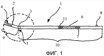 Фиг.10 показывает отделенную от трубы тестовую головку 38 из фиг.8. Тестовая головка 38 имеет приемный элемент 4 для каната в форме двух расположенных друг от друга на расстоянии плеч. Далее, головная часть 2 рычага имеет возможность направленно размещать упорный элемент 18, который обозначен штриховой линией. Дополнительно на упорном элементе 18 может быть помещен, например, крепежный канат 21. Также существует возможность, что между плечами в тестовой головке 38 расположена часть ведущего шкива.