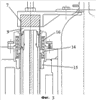 На верхнем конце цилиндра 6 находится приемо-направляющий элемент 13 для цилиндра 6. Этот приемо-направляющий элемент 13 выполнен с возможностью выполнения помимо своих направляющих функций еще и других задач. Для этого этот элемент содержит камеру 14 для пружины и упорную втулку 15, подвижно установленную между трубой 7 и приемо-направляющим элементом 13.