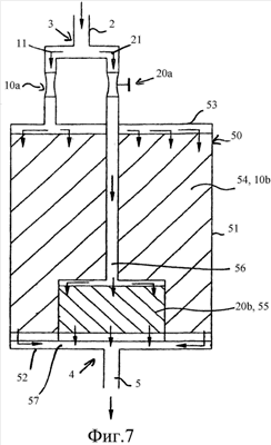 На фиг.7 изображен вертикальный разрез фильтрующего устройства 1. В верхней области изображен приемный канал 2 для неочищенной воды, заканчивающийся в разделительном устройстве 3, которое разделяет подаваемую неочищенную воду на два отдельных потока. Левый отдельный поток подают через участок 10а проточного канала и первый приемный канал 11 к внутренней емкости 50, внутреннее пространство которой образовано, по существу, первой фильтровальной камерой 54, образующей фильтрационный участок 10b. Поступающая через участок 10а проточного канала неочищенная вода разделяется между крышкой 53 и находящимся под ней фильтрующим материалом фильтровальной камеры 54 и проникает через фильтрующий материал, пока не вытечет на нижней стороне и не соберется там в сборной камере 57, откуда она отводится через выпускной канал 5 для чистой воды соединительного устройства 4.