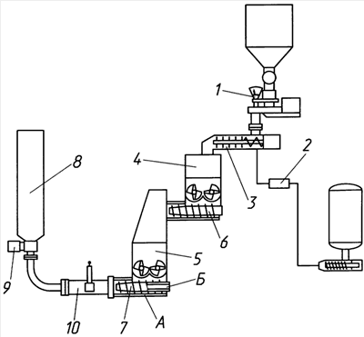 Изготовление изделия СТТ по предлагаемому способу осуществляют методом литья под давлением на установке непрерывного действия, содержащей дозаторы 1, 2, смеситель-приставку 3, предварительный 4 и вакуумный 5 смесители, снабженные шнеками 6, 7.