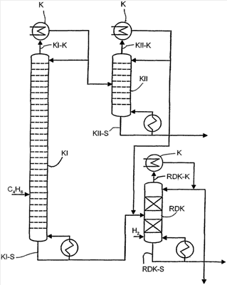 Поток сырого 1,3-бутадиена, обозначаемый как С4Н6, подают в первую дистилляционную колонну K I, где его разделяют на головной поток K I-K и нижний поток K I-S. Головной поток K I-K конденсируют в конденсаторе K в верхней части колонны, часть конденсата возвращают в колонну, а остаток отводят и направляют во вторую дистилляционную колонну K II. Нижний поток K I-S отводят и подают в колонну реакционной дистилляции RDK.