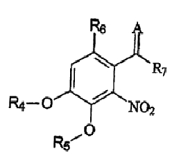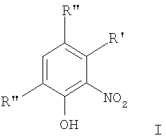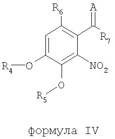 где R’ имеет значения, определенные в п.1, R”, находящийся в орто-положении к гидроксигруппе, означает группу -CO-R1, где R1 имеет значения, определенные в п.1, а другой R” имеет значения, указанные для R6, полученного в соответствии со способом по любому из пп.1-7, с получением соединения формулы IV. 12. Способ по п.11, где фенольное соединение формулы II представляет собой 3-гидрокси-4-метоксибензофенон и промежуточное соединение формулы I представляет собой 3-гидрокси-4-метокси-2-нитробензофенон. 13. Способ по п.11, где соединение формулы IV представляет собой 3-бензоил-6-бутирилокси-2-нитрофениловый эфир масляной кислоты. 14. Способ по п.11, где стадия деалкилирования включает стадию деметилирования. 15. Способ по п.14, где стадия деметилирования включает взаимодействие соединения формулы I с акцептором метила в присутствии катализатора и перекристаллизацию деметилированного продукта. 16. Способ по любому из пп.11-15, где обработка включает стадию ацилирования. 17. Способ по п.16, где стадия ацилирования включает взаимодействие соединения формулы I или его деметилированного эквивалента с ацил-донором в присутствии катализатора. 18. Способ по п.11, где R’ представляет собой -COR1, где R1 представляет собой фенил и R”, находящийся в ортоположении к гидроксигруппе, означает метоксигруппу и обработка включает стадию деметилирования и стадию ацилирования. 19. Способ по п.18, где R4 и R5 оба представляют собой бутирил; R6 представляет водород; R7 представляет фенил; и А представляет кислород. 20. Способ по п.15, где стадия деметилирования включает взаимодействие соединения формулы (I) с акцептором метила в присутствии катализатора, выбранного из группы, состоящей из хлорида алюминия и хлорида пиридиния, и перекристаллизацию деметилированного продукта. 21. Способ по п.16, где стадия ацилирования включает взаимодействие соединение формулы (I) или его деметилированного эквивалента с ацил-донором в присутствии 4-диметиламинопиридинового катализатора.