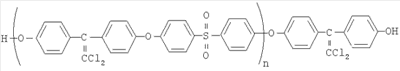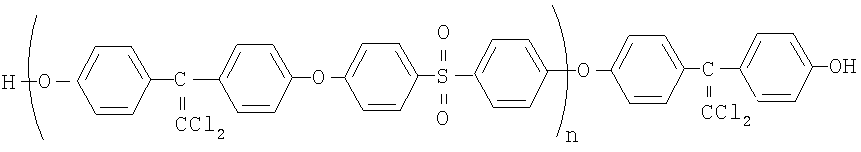 Изобретение относится к высокомолекулярным соединениям, в частности к ароматическим олигоэфирсульфонам, которые могут быть использованы в качестве олигомеров для получения поликонденсационных полимеров. Известны олигомеры на основе 4,4′-диоксидифенилпропана и 4,4-дихлордифенилсульфона, фенолфталеина и 4,4-дихлордифенилсульфона и блок-сополиэфиры на их основе [1-3]. Однако полимеры на их основе характеризуются невысокими значениями кислородного индекса, следовательно, низкой огнестойкостью. Известны олигосульфоны с различными степенями конденсации. Недостатком этих олигосульфонов является их низкая реакционная способность, приводящая к образованию на их основе полиэфиров с невысокой приведенной вязкостью (молекулярной массой). Целью изобретения является расширение ассортимента олигомеров, которые способны вступать в реакцию поликонденсации для получения растворимых блок-сополиэфирсульфонов, в том числе с высокой огнестойкостью. Поставленная цель достигается получением новых олигоэфирсульфонов общей формулы где n=1-20, синтезированными взаимодействием 4,4′-дихлордифенилсульфона с 1,1-дихлор-2,2-ди(n-оксифенил)этиленом в щелочной среде в апротонном диполярном растворителе (диметилсульфоксиде) при 140-145°С в атмосфере инертного газа. Пример 1. Синтез олигоэфирсульфона со степенью конденсации 1. В трехгорлую колбу объемом 150 мл, снабженную мешалкой, обратным холодильником с ловушкой Дина-Старка, барботером для подачи газа и термометром, вносят 5,62281 г (0,02 моль) 1,1-дихлор-2,2-ди(n-оксифенил)этилена, 40 мл диметилсульфоксида (ДМСО) и 30 мл толуола. При перемешивании пропускают азот и поднимают температуру до 70°С. После полного растворения 1,1-дихлор-2,2-ди(n-оксифенил)этилена прибавляют 3,98406 мл 10,04 н. раствора гидроксида натрия. Температуру поднимают до 140-145°С, и отгоняют азеотропную смесь толуол – вода до полного удаления воды. Реакционную массу охлаждают до 40-50°С и добавляют 2,87294 г (0,01 моль) 4,4′-дихлордифенилсульфона. Реакцию ведут при 140-145°С в течение 2 ч. Образовавшуюся массу разбавляют 10 мл ДМСО и высаждают в подкисленную дистиллированную воду. Выпавший осадок отфильтровывают и промывают дистиллированной водой до отрицательной реакции фильтрата на хлор-ион. Полученный олигоэфирсульфон сушат при 100°С под вакуумом 24 часа. Выход светло-желтого продукта 97,5%; температура размягчения 120-122°С; содержание основного вещества не менее 99,9%; допускается в качестве примеси хлорид натрия в количестве не более 0,05-0,1%; мол. м.=776,52084; элементный состав, %: С=61,87/61,75; Н=3,37/3,40; О=12,36/12,31 (в числителе вычислено, в знаменателе – найдено). Содержание гидроксильных групп – 4,38/4,431 (в числителе вычислено, в знаменателе – найдено). В ИК-спектрах обнаружены полосы поглощения в области, см-1: 940-920 (простая эфирная связь), 1100, 1150 и 1290 (сульфонильная группа), 980 (>С=CCl2-группа), 3600-3300 (гидроксильная группа). Методом акцепторно-каталитической поликонденсации на основе предлагаемого олигоэфирсульфона и дихлорангидридов изо- и терефталевой кислот получены блок-сополиэфирсульфоны с количественным выходом и высокими значениями приведенной вязкости (1,5-1,7 дл/г). В качестве органического растворителя использован 1,2-дихлорэтан. Пример 2. Синтез олигоэфирсульфона со степенью конденсации 5. Синтез проводят по примеру 1. Исходные компоненты берут в следующих количествах: 1,43583 г (0,005 мол