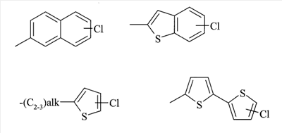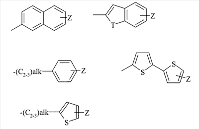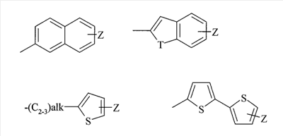 Z представляет собой необязательный заместитель галоген, alk представляет собой алкилен или алкенилен, Т представляет собой S, О или NH; R2 представляет собой водород; Х представляет собой фенильную или 5- или 6-членную ароматическую или неароматическую гетероциклическую группу, содержащую по меньшей мере один гетероатом, выбранный из О, N или S, каждая из которых может быть замещена 0-2 группами, выбранными из галогена, -CN, -С1-4алкила, -CF3, -NRaRb, -(CH2)nORc, -C(O)Rc, -C(O)NRaRb, -S(O)nRc и -S(O)2NRaRb; Y представляет собой заместитель, выбранный из водорода, галогена, -CN, -С1-4алкила, -CF3, NRaRb, -(CH2)nORc, -C(O)Rc, -C(O)NRaRb, -S(O)nRc, -S(O)2NRaRb; Ra и Rb независимо представляют собой водород или -C1-6алкил; Rc представляет собой -C1-6алкил; n представляет собой 0-2; и их фармацевтически приемлемым солям или сольватам. В еще одном аспекте данное изобретение относится к соединениям формулы (I), где Х и Y являются заместителями, указанными выше, а R1 обозначает хлорнафталин, предпочтительно 6-хлорнафталин. Соединения формулы (I) содержат хиральные (асимметрические) центры. Индивидуальные стереоизомеры (энантиомеры и диастереоизомеры) и их смеси охватываются объемом данного изобретения (входят в объем данного изобретения). В соединении формулы (I): Предпочтительно R1 представляет собой группу, выбранную из:
