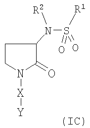 Y представляет собой фенильную, пиразольную, имидазольную или пиридиновую группу, каждая из которых необязательно замещена 0-2 группами, выбранными из галогена, -CN, -С1-4алкила, -CF3, -(CH2)nNRaRb, -(CH2)nORc, -С(O)Rc, -C(O)NRaRb, -S(O)nRc, S(O)2NRaRb. Предпочтительно, когда X является фенилом, Y представляет собой заместитель в 4-положении фенильного кольца (т.е. в пара-положении по отношению к остальной части молекулы). Предпочтительно Ra и Rb независимо представляют собой водород или -С1-6алкил. В соединении формулы (IC): предпочтительно R1 представляет собой группу, выбранную из Z представляет собой необязательный заместитель галоген, Т представляет собой S. Еще более предпочтительно R1 представляет собой группу, выбранную из Z представляет собой необязательный заместитель галоген, Т представляет собой S. Более предпочтительно R1 представляет собой группу, выбранную из Наиболее предпочтительно R1 представляет собой группу, выбранную из Предпочтительно R2 представляет собой водород или CH2CONH2. Предпочтительно X представляет собой фенильную или 5- или 6-членную ароматическую или неароматическую гетероциклическую группу, содержащую по меньшей мере один гетероатом, выбранный из O, N или S, каждая из которых необязательно замещена 0-2 группами, выбранными из галогена, -CN, -С1-4алкила, -С2-4алкенила, -NRаRb, -N(C1-4алкил)(CHO), -NO2, -NHCOC1-4алкила, NHSO2Rс, C0-4алкилOH, -C(O)Rс и -C(O)NRaRb. Более предпочтительно X представляет собой фенильную или 5- или 6-членную ароматическую гетероциклическую группу, содержащую по меньшей мере один гетероатом, выбранный из O, N или S, каждая из которых необязательно замещена 0-2 группами, выбранными из галогена, -CN, -С2-4алкенила, -NRаRb, -N(C1-4алкил)(CHO), -NO2, C0-4алкилOH, -C(O)Rс и -C(O)NRaRb. Еще более предпочтительно X представляет собой фенильную группу или 5- или 6-членную ароматическую гетероциклическую группу, содержащую, по меньшей мере, один гетероатом, выбранный из O, N или S, каждая из которых необязательно замещена 0-2 группами, выбранными из галогена, -CN, -N(C1-4алкил)(CHO), -C(O)Rс и -C(O)NRaRb. Еще более предпочтительно X представляет собой фенильную группу, необязательно замещенную галогеном, или 5- или 6-членную ароматическую гетероциклическую группу, содержащую, по меньшей мере, один гетероатом, выбранный из O, N или S. Еще более предпочтительно X представляет собой фенильную группу, замещенную галогеном или пиридином. Еще более предпочтительно X представляет собой фенильную группу, замещенную галогеном. Наиболее предпочтительно X представляет собой фенильную группу, замещенную в 2-положении галогеном. Предпочтительно Y представляет собой заместитель, выбранный из водорода, галогена, -CN, -С1-4алкила, С2-4алкенила, -NRaRb, NO2, -N(C1-4алкил)(CHO), -NHCOC1-4алкила, NHSO2Rс, C0-4алкилORd, -C(O)Rс или -C(O)NRaRb. Более предпочтительно Y представляет собой заместитель, выбранный из водорода, галогена, -CN, С2-4алкенила, -NRaRb, NO2, -N(C1-4алкил)(CHO), C1-4алкилOH, -C(O)Rс или -C(O)NRaRb. Еще более предпочтительно Y представляет собой заместитель, выбранный из водорода, галогена, -CN, С2-4алкенила, -N(C1-4алкил)(CHO), C1-4алкилOH, -C(O)Rс или -C(O)NRaRb. Наиболее предпочтительно Y представляет собой заместитель, выбранный из водорода, галогена, -CN, -C(O)Rс или -C(O)NRaRb. Предпочтительно, если в случае, когда Х является фенилом, Y представляет собой заместитель в 4-положении фенильного кольца (т.е. в пара-положении по отношению к остальной части молекулы). Понятно, что данное изобретение охватывает в