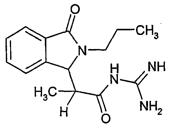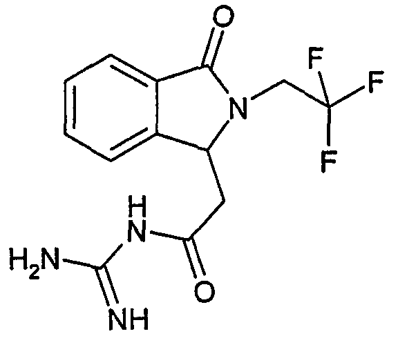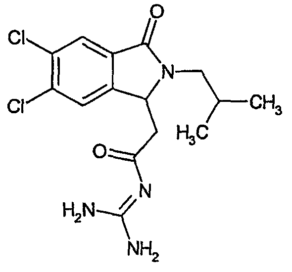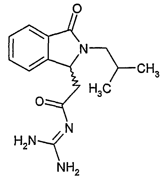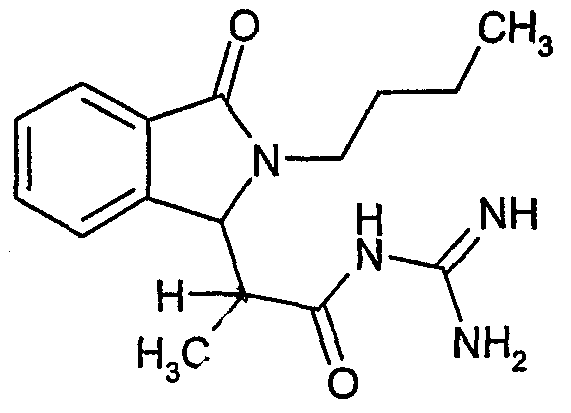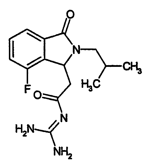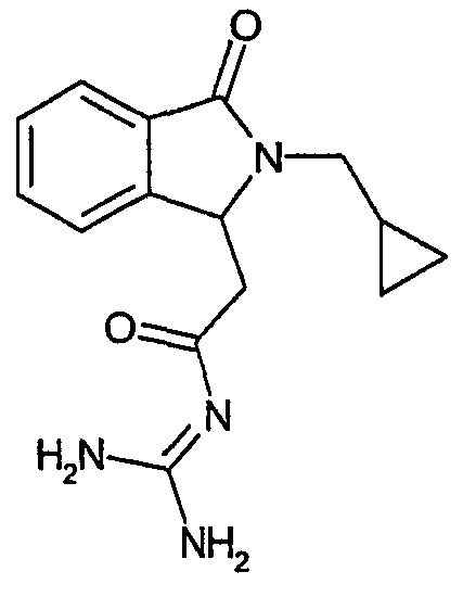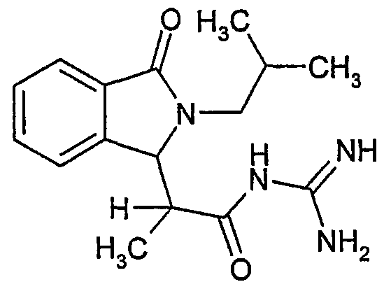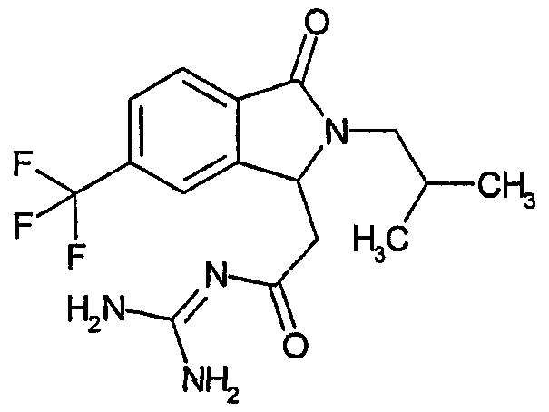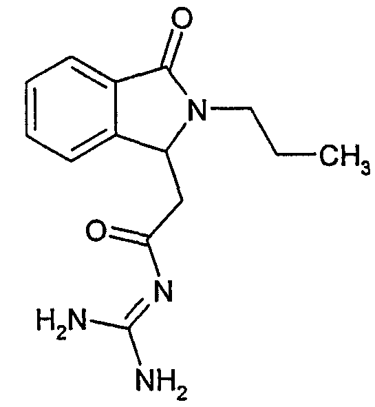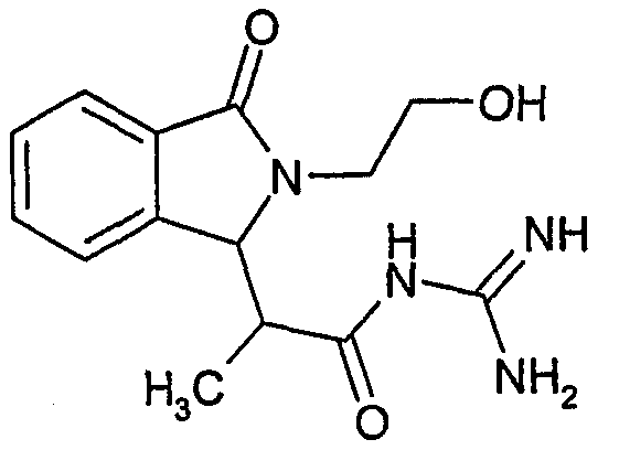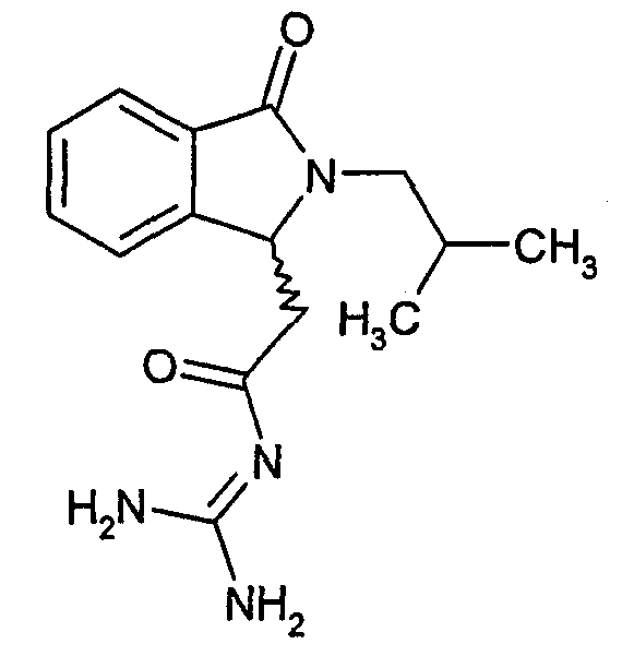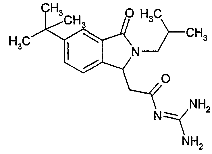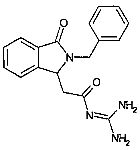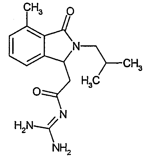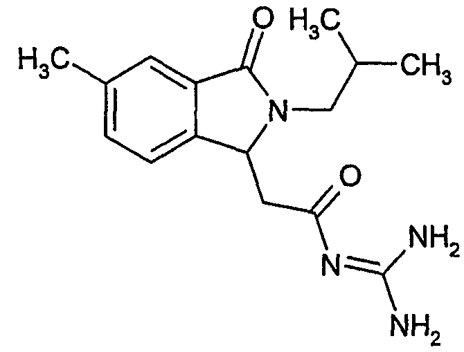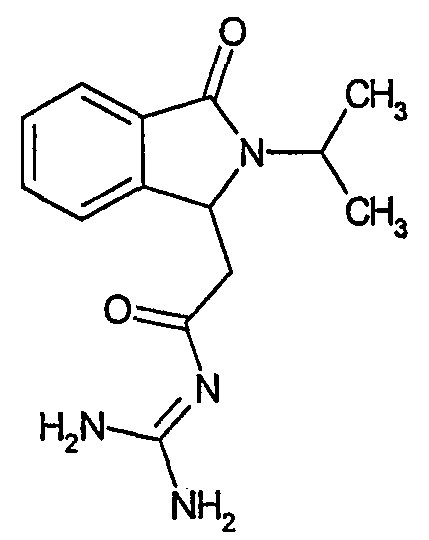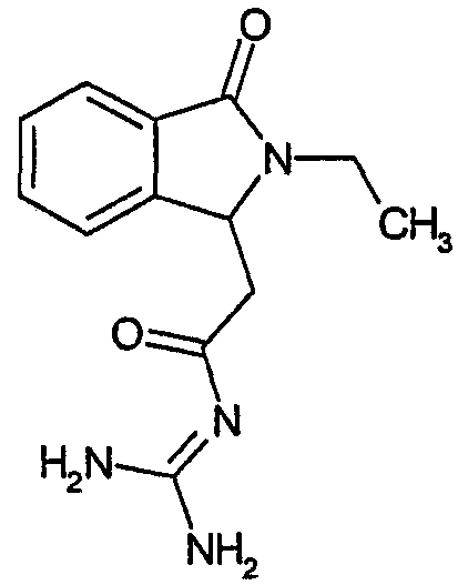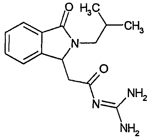 Изобретение иллюстрируют следующие примеры. Пример 1: а) N-[2-(2-Метил-3-оксо-2,3-дигидро-1Н-изоиндол-1-ил)ацетил]гуанидин К суспензии 5,2 г трет-бутоксида калия в 100 мл диметилформамида добавляют 4,3 г гуанидинийхлорида. Реакционную смесь перемешивают в инертной атмосфере при температуре примерно 20°С в течение 1 часа и затем добавляют раствор 2 г этил(2-метил-3-оксо-2,3-дигидро-1Н-изоиндол-1-ил)ацетата в 20 мл диметилформамида. Реакционную смесь перемешивают при температуре примерно 20°С в течение 16 часов, затем добавляют 100 мл воды. Доводят рН до 8 добавлением 50 мл 1 н. хлористоводородной кислоты и смесь концентрируют при пониженном давлении (0,6 кПа) при температуре примерно 30°С. Полученный после выпаривания остаток переносят в воду и затем фильтруют. В результате получают 0,35 г N-[(2-метил-3-оксо-2,3-дигидро-1Н-изоиндол-1-ил)ацетил]гуанидина в виде не совсем белого твердого вещества, плавящегося при 214°С. Масс-спектр Е1: m/e 246 (M+), m/e 159 (основной пик), m/e 146. b) Этил(2-метил-3-оксо-2,3-дигидро-1Н-изоиндол-1-ил)ацетат 11,5 г этоксикарбонилметилентрифенилфосфорана добавляют к суспензии 4,5 г 3-гидрокси-2-метил-2,3-дигидроизоиндол-1-она в 110 мл толуола. Реакционную смесь кипятят с обратным холодильником при перемешивании в течение 16 часов и затем охлаждают до температуры примерно 20°С. Затем смесь концентрируют досуха при пониженном давлении (2 кПа) и температуре примерно 40°С. Оставшееся масло переносят в 50 мл диэтилового эфира. Образовавшийся остаток отфильтровывают и затем промывают дважды 10 мл диэтилового эфира. Фильтрат концентрируют досуха при пониженном давлении (2 кПа) и температуре примерно 40°С с получением окрашенного в оранжевый цвет масла, которое очищают хроматографией под давлением аргона (60 кПа) на колонке с силикагелем (размер частиц 20-45 мкм) при последовательном элюировании смесями циклогексан/этилацетат (70/30, 65/35, 60/40 по объему). Фракции, содержащие ожидаемый продукт, объединяют и концентрируют при пониженном давлении (2 кПа) при температуре примерно 30°С. В результате получают 4,1 г этил(2-метил-3-оксо-2,3-дигидро-1Н-изоиндол-1-ил)ацетата в виде желтого масла. (Rf=0,25, тонкослойная хроматография на силикагеле, элюент: смесь циклогексан/этилацетат (50/50 по объему)). с) 3-Гидрокси-2-метил-2,3-дигидроизоиндол-1-он 3,4 г Боргидрида калия медленно добавляют к суспензии 10 г N-метилфталимида в 220 мл метанола в инертной атмосфере. Реакционную смесь перемешивают при температуре примерно 20°С в течение 20 часов и затем по каплям добавляют 200 мл дистиллированной воды. Затем частично (около 120 мл) выпаривают растворитель при пониженном давлении (2 кПа) и температуре около 35°С и остаток разбавляют 400 мл дистиллированной воды. Смесь экстрагируют 400 мл этилацетата. Органическую фазу сушат над сульфатом магния, фильтруют и затем концентрируют досуха при пониженном давлении (2 кПа) и температуре примерно 30°С. В результате получают 4,5 г 3-гидрокси-2-метил-2,3-дигидроизоиндол-1-она в виде белого порошка, плавящегося при 130°С. Пример 2 а) N-[2-(2-изобутил-3-оксо-2,3-дигидро-1Н-изоиндол-1-ил)ацетил]гуанидин N-[(2-изобутил-3-оксо-2,3-дигидро-1Н-изоиндол-1-ил)ацетил]гуанидин получают, следуя методике примера 1, с использованием в качестве исходных продуктов 5 г трет-бутоксида калия, 5,2 г гуанидинийхлорида и 2,5 г этил(2-изобутил-3-оксо-2,3-дигидро-1Н-изоиндол-1-ил)ацетата. Реакционную смесь перемешивают при температуре примерно 2