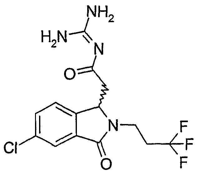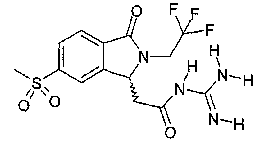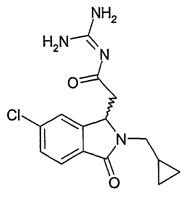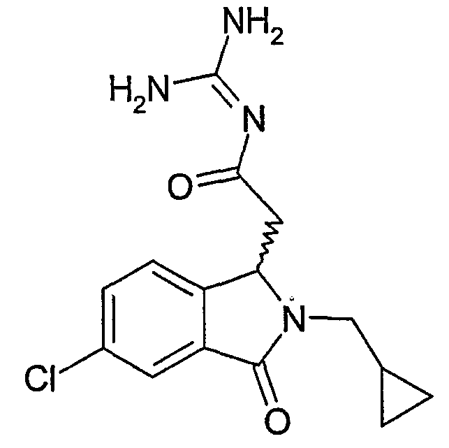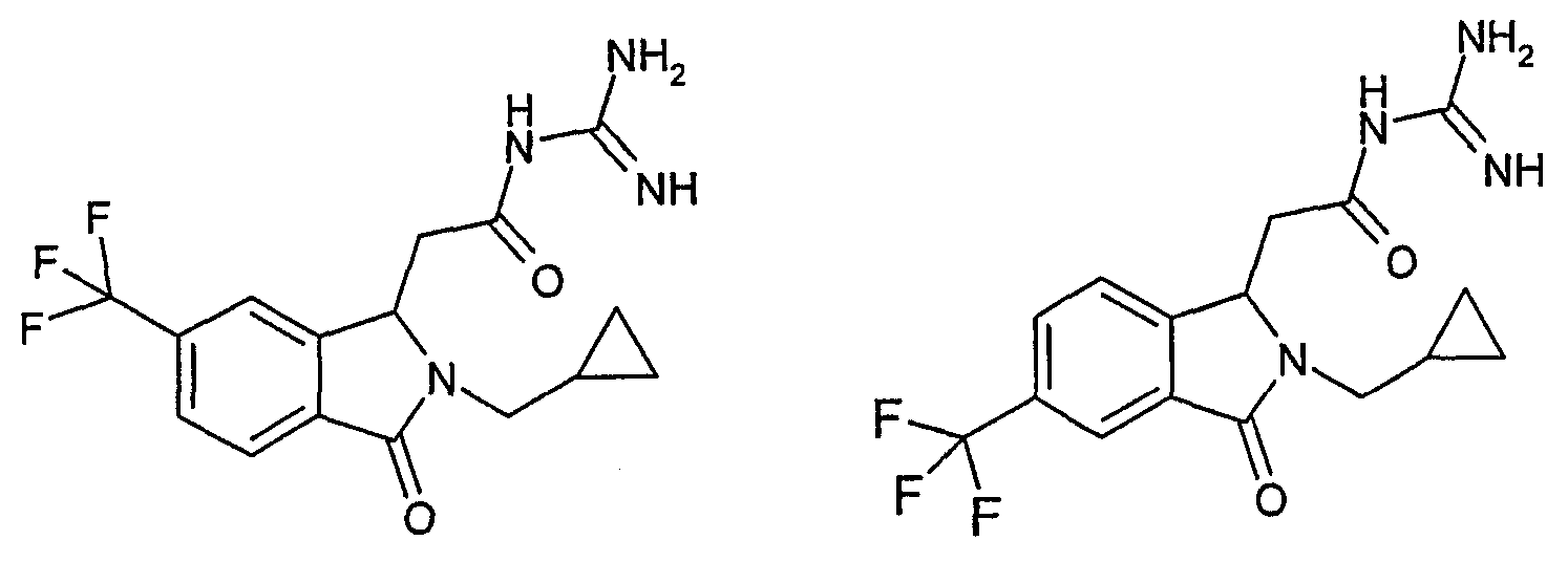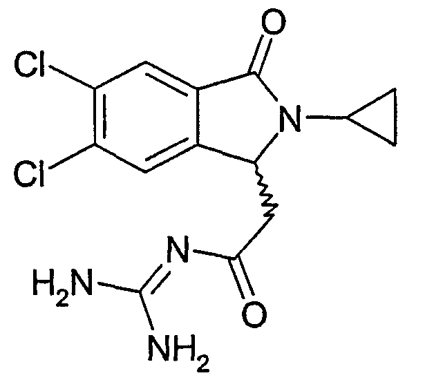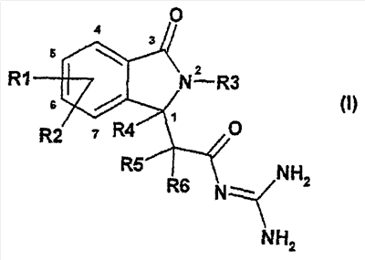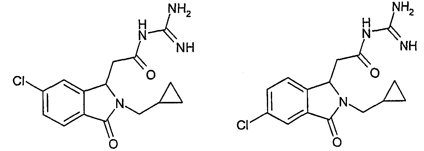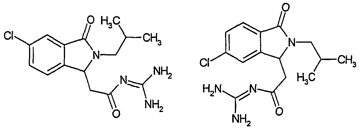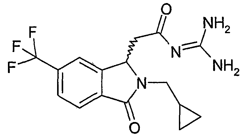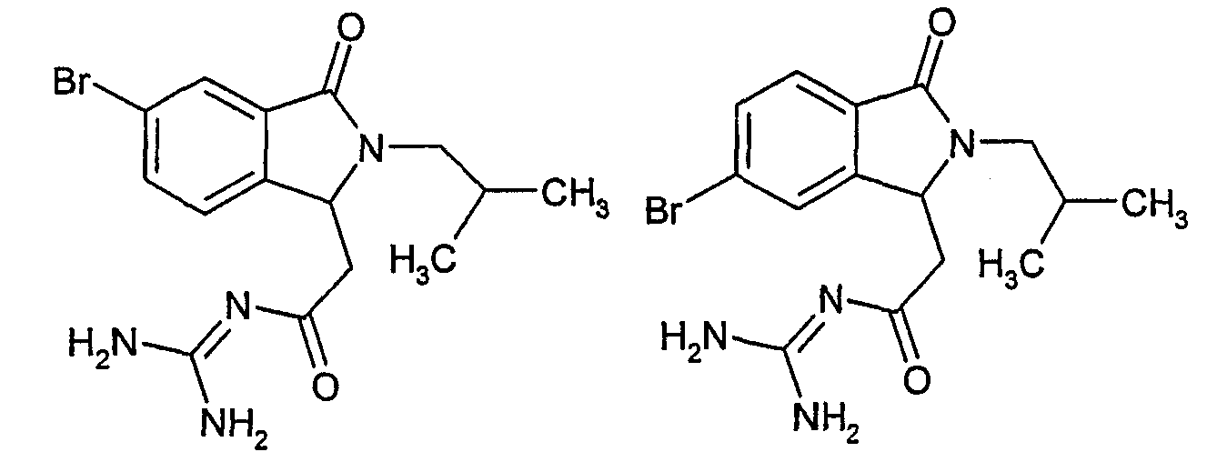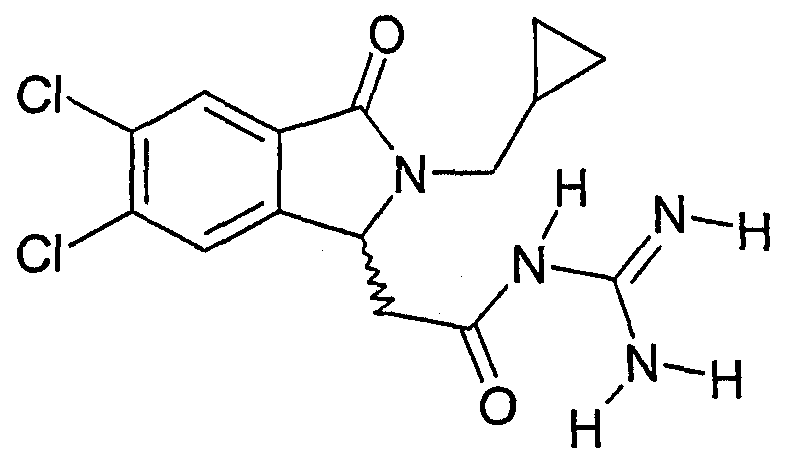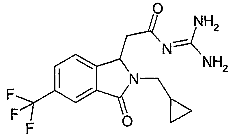 Изобретение иллюстрируют следующие примеры. Пример 1: а) N-[2-(2-Метил-3-оксо-2,3-дигидро-1Н-изоиндол-1-ил)ацетил]гуанидин К суспензии 5,2 г трет-бутоксида калия в 100 мл диметилформамида добавляют 4,3 г гуанидинийхлорида. Реакционную смесь перемешивают в инертной атмосфере при температуре примерно 20°С в течение 1 часа и затем добавляют раствор 2 г этил(2-метил-3-оксо-2,3-дигидро-1Н-изоиндол-1-ил)ацетата в 20 мл диметилформамида. Реакционную смесь перемешивают при температуре примерно 20°С в течение 16 часов, затем добавляют 100 мл воды. Доводят рН до 8 добавлением 50 мл 1 н. хлористоводородной кислоты и смесь концентрируют при пониженном давлении (0,6 кПа) при температуре примерно 30°С. Полученный после выпаривания остаток переносят в воду и затем фильтруют. В результате получают 0,35 г N-[(2-метил-3-оксо-2,3-дигидро-1Н-изоиндол-1-ил)ацетил]гуанидина в виде не совсем белого твердого вещества, плавящегося при 214°С. Масс-спектр Е1: m/e 246 (M+), m/e 159 (основной пик), m/e 146. b) Этил(2-метил-3-оксо-2,3-дигидро-1Н-изоиндол-1-ил)ацетат 11,5 г этоксикарбонилметилентрифенилфосфорана добавляют к суспензии 4,5 г 3-гидрокси-2-метил-2,3-дигидроизоиндол-1-она в 110 мл толуола. Реакционную смесь кипятят с обратным холодильником при перемешивании в течение 16 часов и затем охлаждают до температуры примерно 20°С. Затем смесь концентрируют досуха при пониженном давлении (2 кПа) и температуре примерно 40°С. Оставшееся масло переносят в 50 мл диэтилового эфира. Образовавшийся остаток отфильтровывают и затем промывают дважды 10 мл диэтилового эфира. Фильтрат концентрируют досуха при пониженном давлении (2 кПа) и температуре примерно 40°С с получением окрашенного в оранжевый цвет масла, которое очищают хроматографией под давлением аргона (60 кПа) на колонке с силикагелем (размер частиц 20-45 мкм) при последовательном элюировании смесями циклогексан/этилацетат (70/30, 65/35, 60/40 по объему). Фракции, содержащие ожидаемый продукт, объединяют и концентрируют при пониженном давлении (2 кПа) при температуре примерно 30°С. В результате получают 4,1 г этил(2-метил-3-оксо-2,3-дигидро-1Н-изоиндол-1-ил)ацетата в виде желтого масла. (Rf=0,25, тонкослойная хроматография на силикагеле, элюент: смесь циклогексан/этилацетат (50/50 по объему)). с) 3-Гидрокси-2-метил-2,3-дигидроизоиндол-1-он 3,4 г Боргидрида калия медленно добавляют к суспензии 10 г N-метилфталимида в 220 мл метанола в инертной атмосфере. Реакционную смесь перемешивают при температуре примерно 20°С в течение 20 часов и затем по каплям добавляют 200 мл дистиллированной воды. Затем частично (около 120 мл) выпаривают растворитель при пониженном давлении (2 кПа) и температуре около 35°С и остаток разбавляют 400 мл дистиллированной воды. Смесь экстрагируют 400 мл этилацетата. Органическую фазу сушат над сульфатом магния, фильтруют и затем концентрируют досуха при пониженном давлении (2 кПа) и температуре примерно 30°С. В результате получают 4,5 г 3-гидрокси-2-метил-2,3-дигидроизоиндол-1-она в виде белого порошка, плавящегося при 130°С. Пример 2 а) N-[2-(2-изобутил-3-оксо-2,3-дигидро-1Н-изоиндол-1-ил)ацетил]гуанидин N-[(2-изобутил-3-оксо-2,3-дигидро-1Н-изоиндол-1-ил)ацетил]гуанидин получают, следуя методике примера 1, с использованием в качестве исходных продуктов 5 г трет-бутоксида калия, 5,2 г гуанидинийхлорида и 2,5 г этил(2-изобутил-3-оксо-2,3-дигидро-1Н-изоиндол-1-ил)ацетата. Реакционную смесь перемешивают при температуре примерно 2