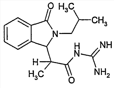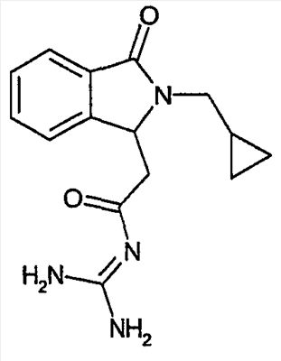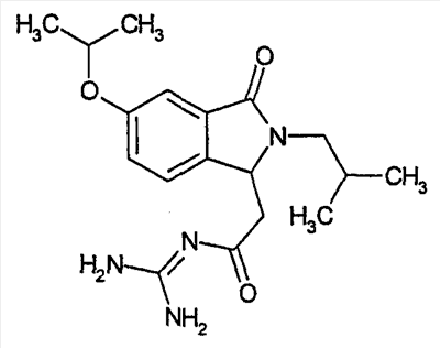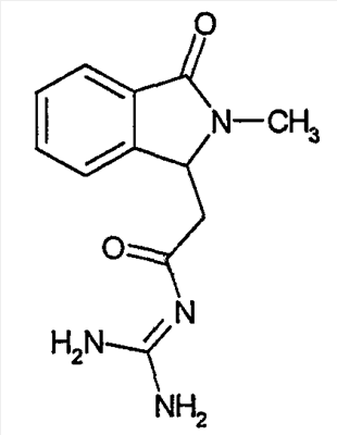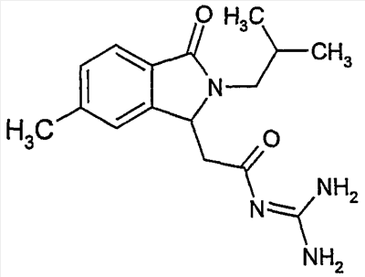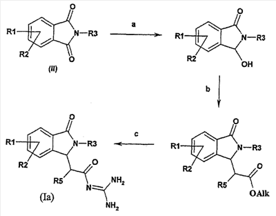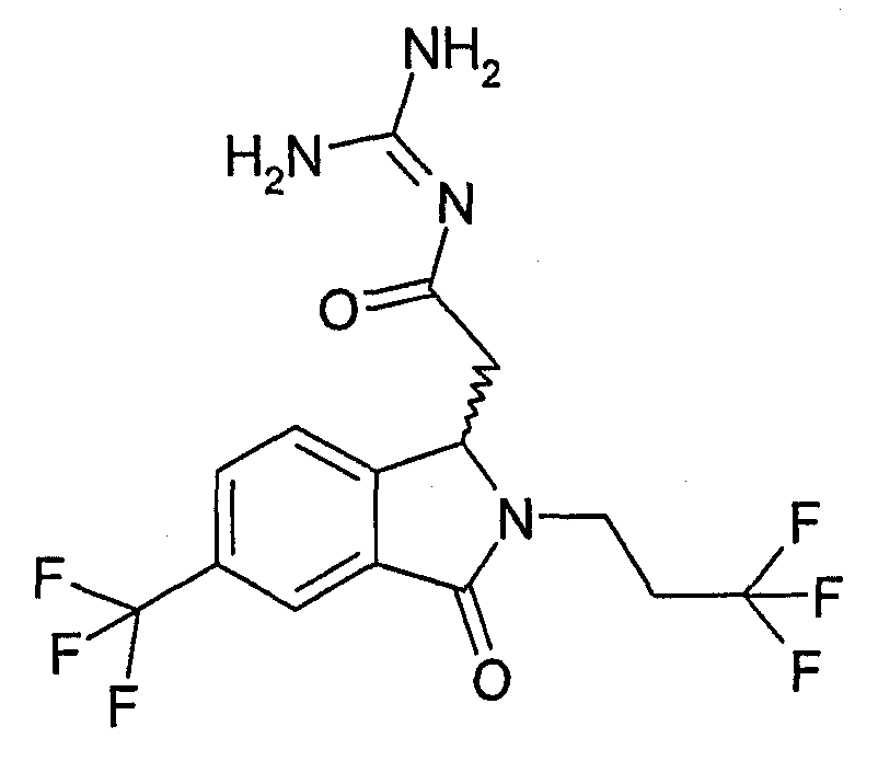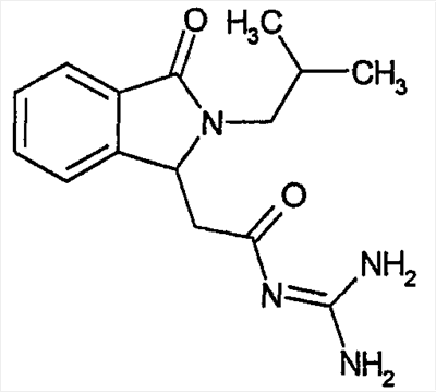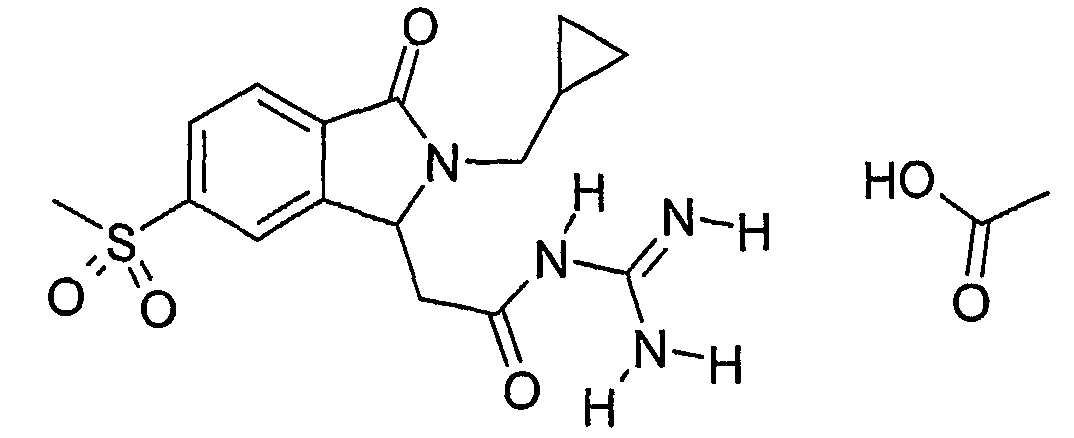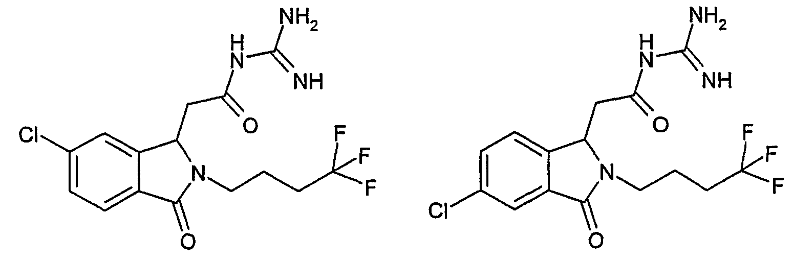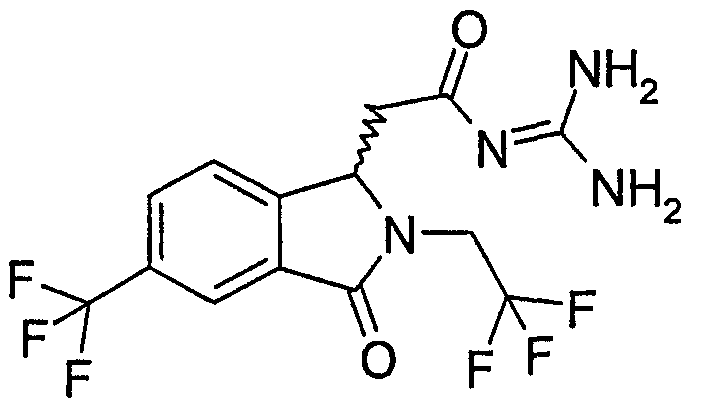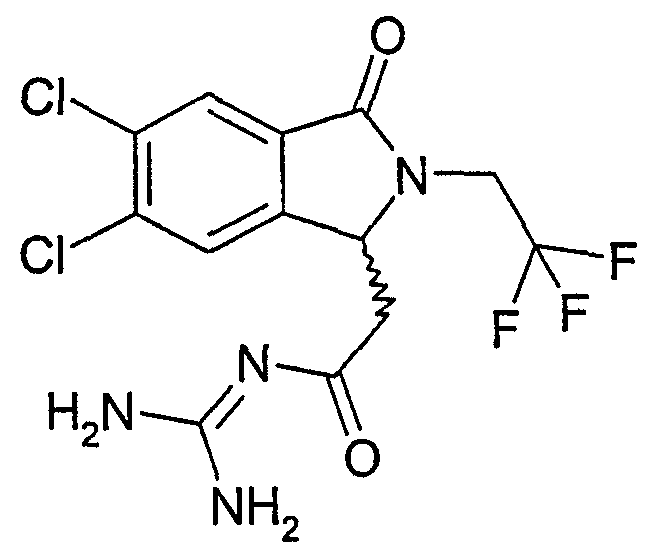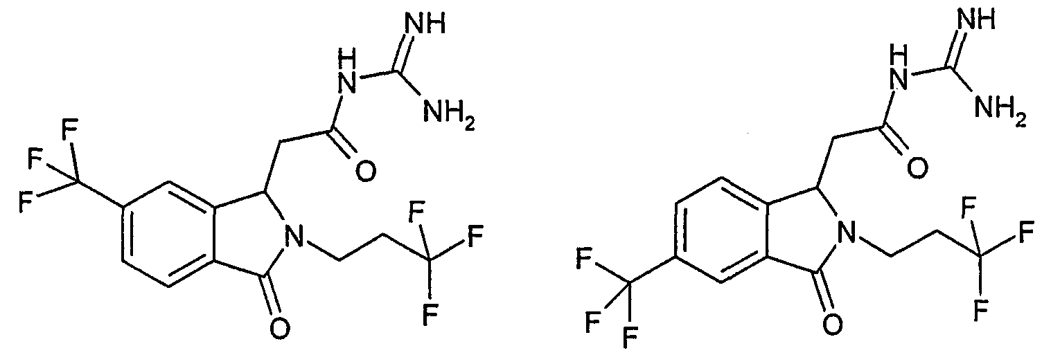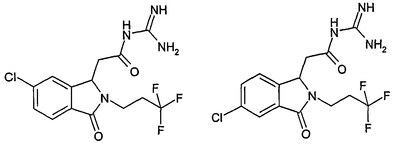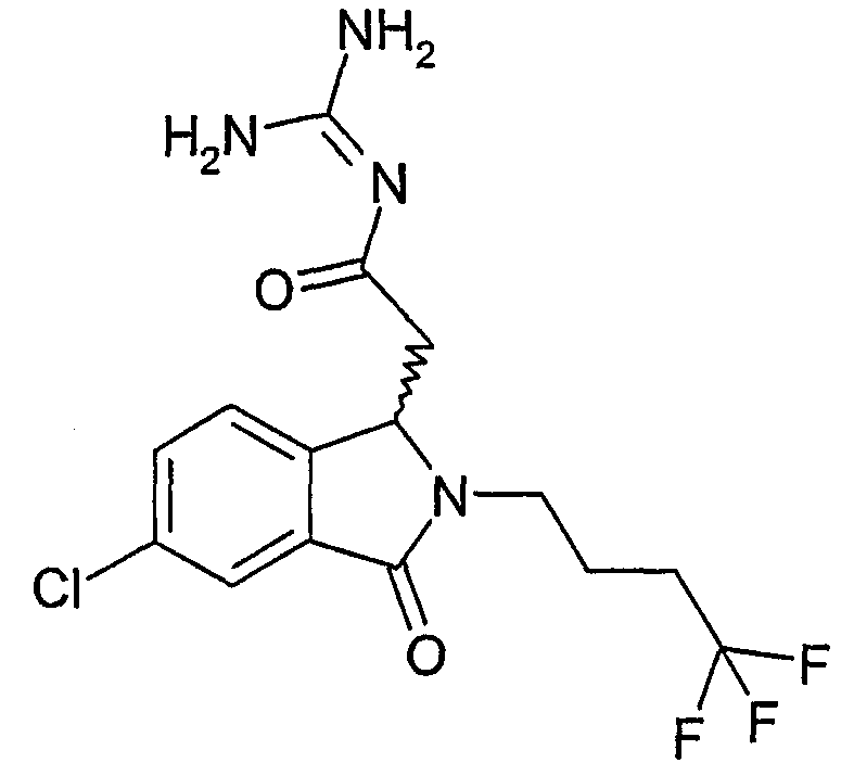 Изобретение иллюстрируют следующие примеры. Пример 1: а) N-[2-(2-Метил-3-оксо-2,3-дигидро-1Н-изоиндол-1-ил)ацетил]гуанидин К суспензии 5,2 г трет-бутоксида калия в 100 мл диметилформамида добавляют 4,3 г гуанидинийхлорида. Реакционную смесь перемешивают в инертной атмосфере при температуре примерно 20°С в течение 1 часа и затем добавляют раствор 2 г этил(2-метил-3-оксо-2,3-дигидро-1Н-изоиндол-1-ил)ацетата в 20 мл диметилформамида. Реакционную смесь перемешивают при температуре примерно 20°С в течение 16 часов, затем добавляют 100 мл воды. Доводят рН до 8 добавлением 50 мл 1 н. хлористоводородной кислоты и смесь концентрируют при пониженном давлении (0,6 кПа) при температуре примерно 30°С. Полученный после выпаривания остаток переносят в воду и затем фильтруют. В результате получают 0,35 г N-[(2-метил-3-оксо-2,3-дигидро-1Н-изоиндол-1-ил)ацетил]гуанидина в виде не совсем белого твердого вещества, плавящегося при 214°С. Масс-спектр Е1: m/e 246 (M+), m/e 159 (основной пик), m/e 146. b) Этил(2-метил-3-оксо-2,3-дигидро-1Н-изоиндол-1-ил)ацетат 11,5 г этоксикарбонилметилентрифенилфосфорана добавляют к суспензии 4,5 г 3-гидрокси-2-метил-2,3-дигидроизоиндол-1-она в 110 мл толуола. Реакционную смесь кипятят с обратным холодильником при перемешивании в течение 16 часов и затем охлаждают до температуры примерно 20°С. Затем смесь концентрируют досуха при пониженном давлении (2 кПа) и температуре примерно 40°С. Оставшееся масло переносят в 50 мл диэтилового эфира. Образовавшийся остаток отфильтровывают и затем промывают дважды 10 мл диэтилового эфира. Фильтрат концентрируют досуха при пониженном давлении (2 кПа) и температуре примерно 40°С с получением окрашенного в оранжевый цвет масла, которое очищают хроматографией под давлением аргона (60 кПа) на колонке с силикагелем (размер частиц 20-45 мкм) при последовательном элюировании смесями циклогексан/этилацетат (70/30, 65/35, 60/40 по объему). Фракции, содержащие ожидаемый продукт, объединяют и концентрируют при пониженном давлении (2 кПа) при температуре примерно 30°С. В результате получают 4,1 г этил(2-метил-3-оксо-2,3-дигидро-1Н-изоиндол-1-ил)ацетата в виде желтого масла. (Rf=0,25, тонкослойная хроматография на силикагеле, элюент: смесь циклогексан/этилацетат (50/50 по объему)). с) 3-Гидрокси-2-метил-2,3-дигидроизоиндол-1-он 3,4 г Боргидрида калия медленно добавляют к суспензии 10 г N-метилфталимида в 220 мл метанола в инертной атмосфере. Реакционную смесь перемешивают при температуре примерно 20°С в течение 20 часов и затем по каплям добавляют 200 мл дистиллированной воды. Затем частично (около 120 мл) выпаривают растворитель при пониженном давлении (2 кПа) и температуре около 35°С и остаток разбавляют 400 мл дистиллированной воды. Смесь экстрагируют 400 мл этилацетата. Органическую фазу сушат над сульфатом магния, фильтруют и затем концентрируют досуха при пониженном давлении (2 кПа) и температуре примерно 30°С. В результате получают 4,5 г 3-гидрокси-2-метил-2,3-дигидроизоиндол-1-она в виде белого порошка, плавящегося при 130°С. Пример 2 а) N-[2-(2-изобутил-3-оксо-2,3-дигидро-1Н-изоиндол-1-ил)ацетил]гуанидин N-[(2-изобутил-3-оксо-2,3-дигидро-1Н-изоиндол-1-ил)ацетил]гуанидин получают, следуя методике примера 1, с использованием в качестве исходных продуктов 5 г трет-бутоксида калия, 5,2 г гуанидинийхлорида и 2,5 г этил(2-изобутил-3-оксо-2,3-дигидро-1Н-изоиндол-1-ил)ацетата. Реакционную смесь перемешивают при температуре примерно 2