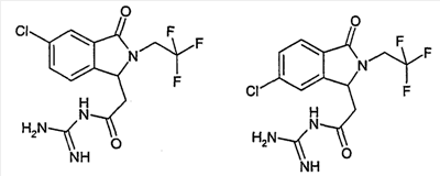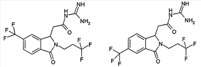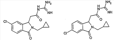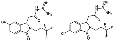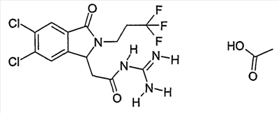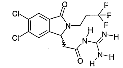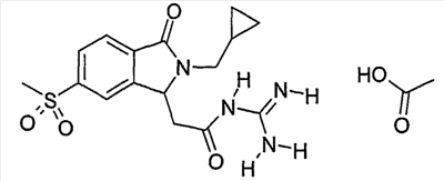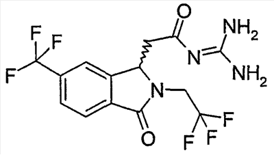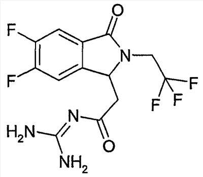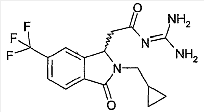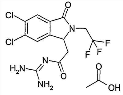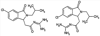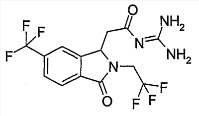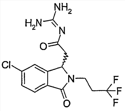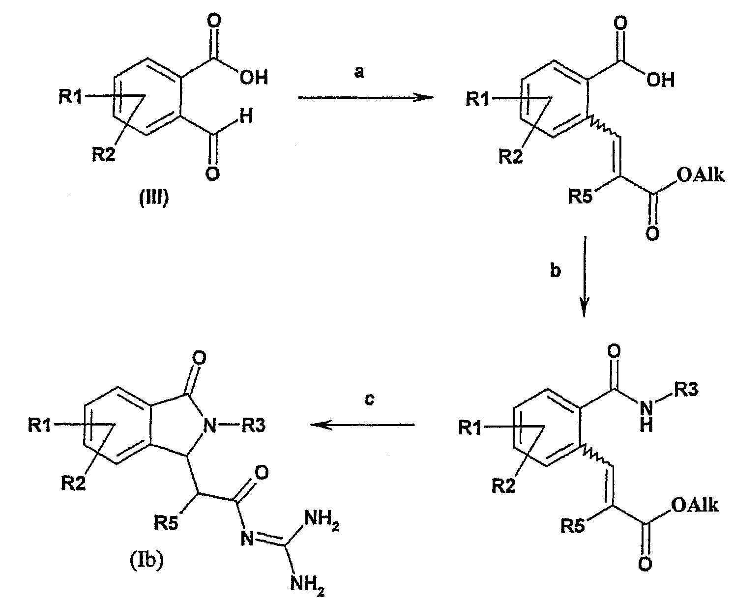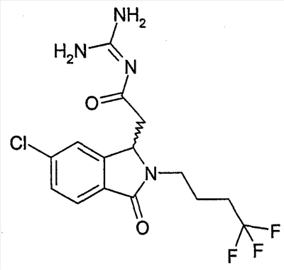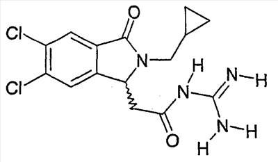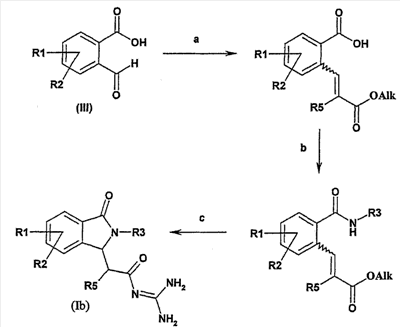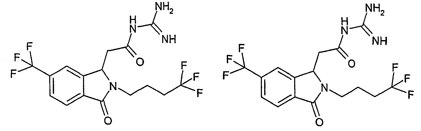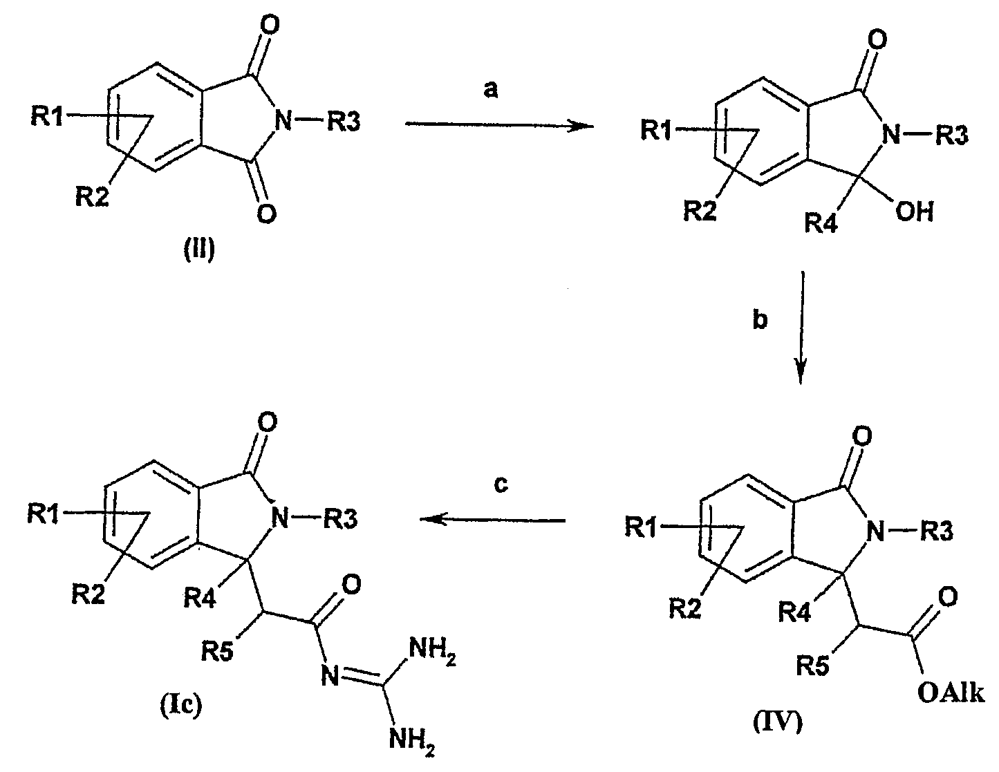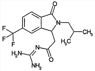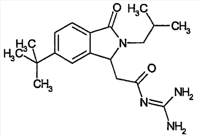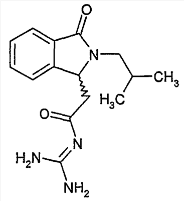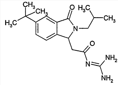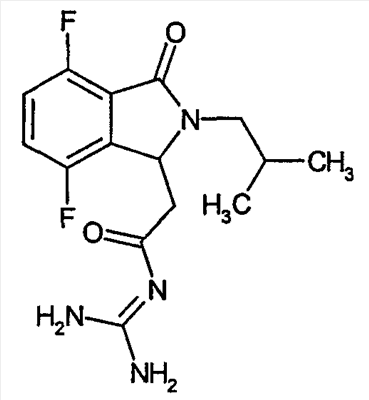 Изобретение иллюстрируют следующие примеры. Пример 1: а) N-[2-(2-Метил-3-оксо-2,3-дигидро-1Н-изоиндол-1-ил)ацетил]гуанидин К суспензии 5,2 г трет-бутоксида калия в 100 мл диметилформамида добавляют 4,3 г гуанидинийхлорида. Реакционную смесь перемешивают в инертной атмосфере при температуре примерно 20°С в течение 1 часа и затем добавляют раствор 2 г этил(2-метил-3-оксо-2,3-дигидро-1Н-изоиндол-1-ил)ацетата в 20 мл диметилформамида. Реакционную смесь перемешивают при температуре примерно 20°С в течение 16 часов, затем добавляют 100 мл воды. Доводят рН до 8 добавлением 50 мл 1 н. хлористоводородной кислоты и смесь концентрируют при пониженном давлении (0,6 кПа) при температуре примерно 30°С. Полученный после выпаривания остаток переносят в воду и затем фильтруют. В результате получают 0,35 г N-[(2-метил-3-оксо-2,3-дигидро-1Н-изоиндол-1-ил)ацетил]гуанидина в виде не совсем белого твердого вещества, плавящегося при 214°С. Масс-спектр Е1: m/e 246 (M+), m/e 159 (основной пик), m/e 146. b) Этил(2-метил-3-оксо-2,3-дигидро-1Н-изоиндол-1-ил)ацетат 11,5 г этоксикарбонилметилентрифенилфосфорана добавляют к суспензии 4,5 г 3-гидрокси-2-метил-2,3-дигидроизоиндол-1-она в 110 мл толуола. Реакционную смесь кипятят с обратным холодильником при перемешивании в течение 16 часов и затем охлаждают до температуры примерно 20°С. Затем смесь концентрируют досуха при пониженном давлении (2 кПа) и температуре примерно 40°С. Оставшееся масло переносят в 50 мл диэтилового эфира. Образовавшийся остаток отфильтровывают и затем промывают дважды 10 мл диэтилового эфира. Фильтрат концентрируют досуха при пониженном давлении (2 кПа) и температуре примерно 40°С с получением окрашенного в оранжевый цвет масла, которое очищают хроматографией под давлением аргона (60 кПа) на колонке с силикагелем (размер частиц 20-45 мкм) при последовательном элюировании смесями циклогексан/этилацетат (70/30, 65/35, 60/40 по объему). Фракции, содержащие ожидаемый продукт, объединяют и концентрируют при пониженном давлении (2 кПа) при температуре примерно 30°С. В результате получают 4,1 г этил(2-метил-3-оксо-2,3-дигидро-1Н-изоиндол-1-ил)ацетата в виде желтого масла. (Rf=0,25, тонкослойная хроматография на силикагеле, элюент: смесь циклогексан/этилацетат (50/50 по объему)). с) 3-Гидрокси-2-метил-2,3-дигидроизоиндол-1-он 3,4 г Боргидрида калия медленно добавляют к суспензии 10 г N-метилфталимида в 220 мл метанола в инертной атмосфере. Реакционную смесь перемешивают при температуре примерно 20°С в течение 20 часов и затем по каплям добавляют 200 мл дистиллированной воды. Затем частично (около 120 мл) выпаривают растворитель при пониженном давлении (2 кПа) и температуре около 35°С и остаток разбавляют 400 мл дистиллированной воды. Смесь экстрагируют 400 мл этилацетата. Органическую фазу сушат над сульфатом магния, фильтруют и затем концентрируют досуха при пониженном давлении (2 кПа) и температуре примерно 30°С. В результате получают 4,5 г 3-гидрокси-2-метил-2,3-дигидроизоиндол-1-она в виде белого порошка, плавящегося при 130°С. Пример 2 а) N-[2-(2-изобутил-3-оксо-2,3-дигидро-1Н-изоиндол-1-ил)ацетил]гуанидин N-[(2-изобутил-3-оксо-2,3-дигидро-1Н-изоиндол-1-ил)ацетил]гуанидин получают, следуя методике примера 1, с использованием в качестве исходных продуктов 5 г трет-бутоксида калия, 5,2 г гуанидинийхлорида и 2,5 г этил(2-изобутил-3-оксо-2,3-дигидро-1Н-изоиндол-1-ил)ацетата. Реакционную смесь перемешивают при температуре примерно 2